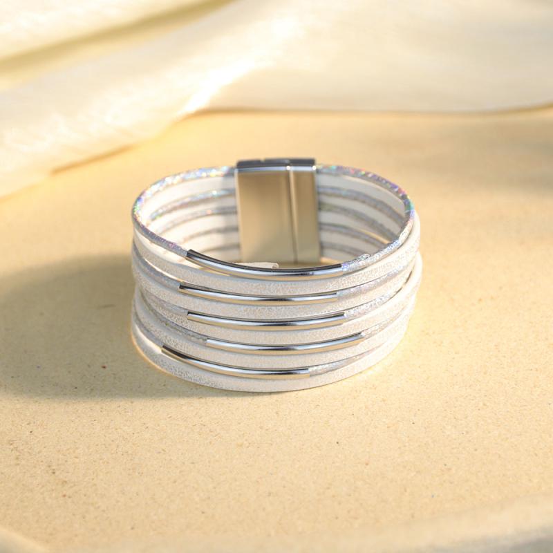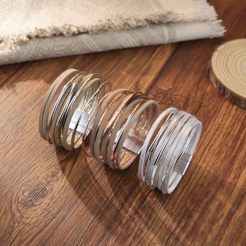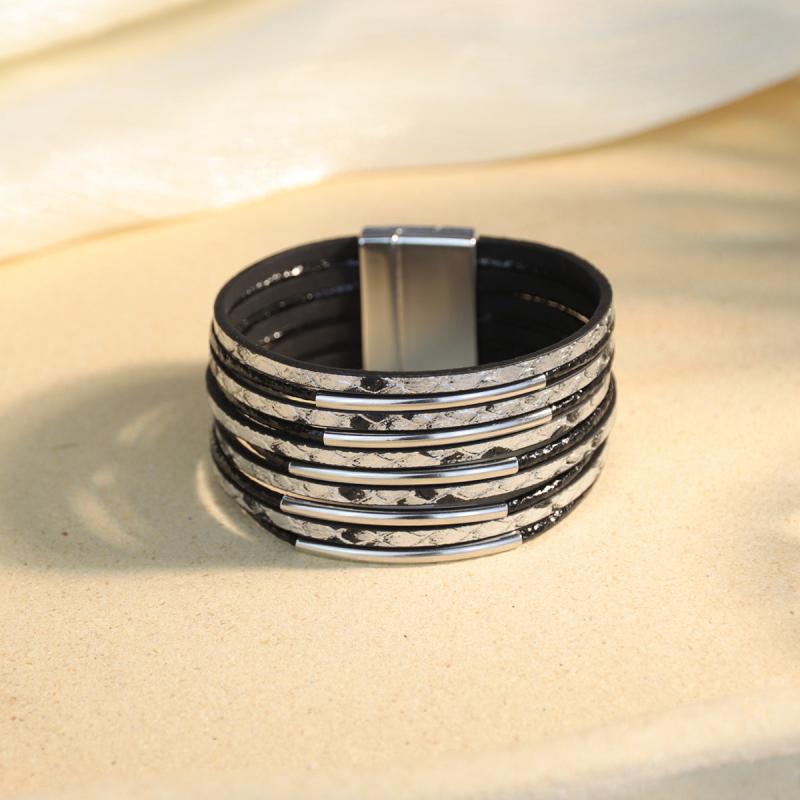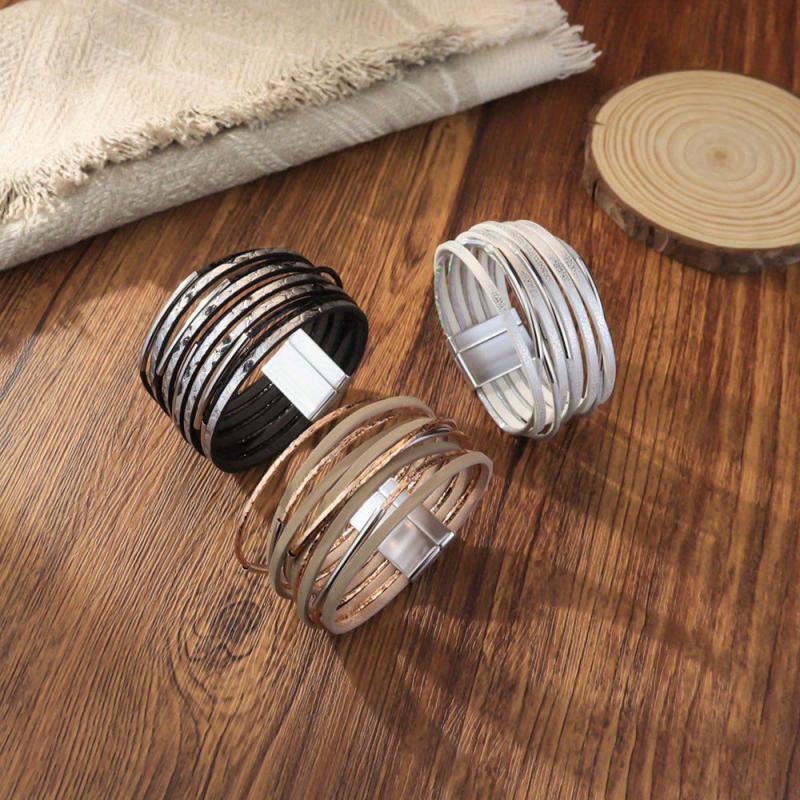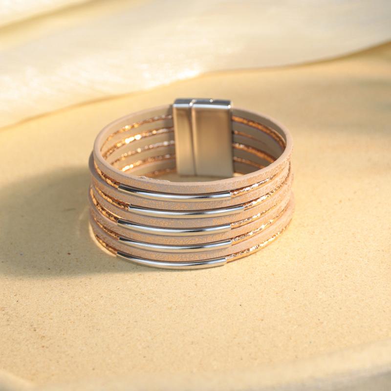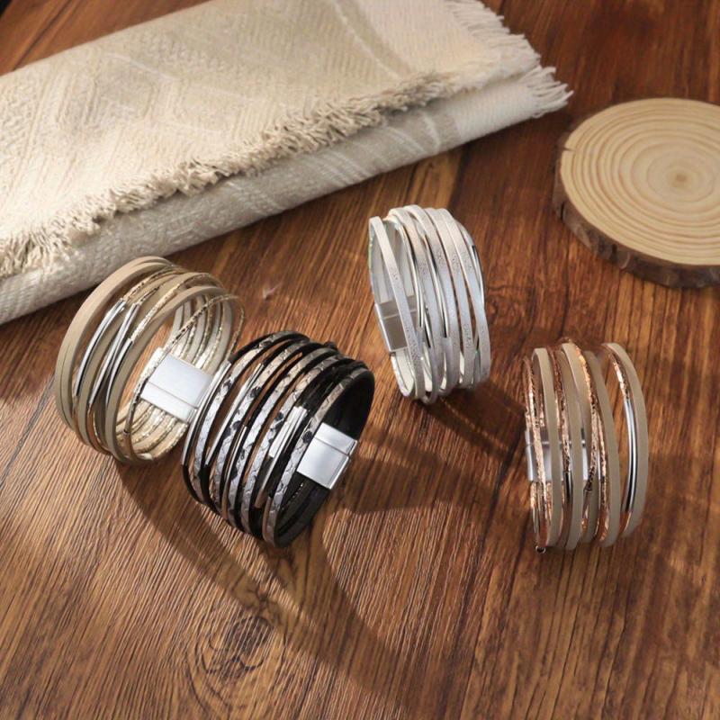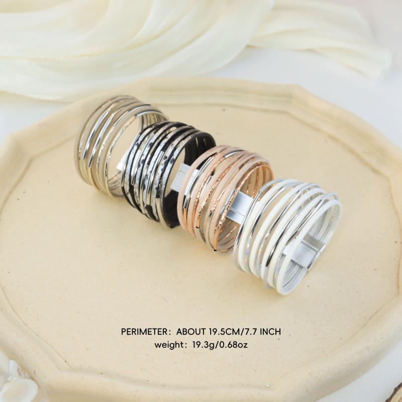 Add a touch of bohemian flair with this sweet and edgy layered glossy PU magnetic clasp bracelet in rose golden tone. The wide edge twist design makes it a versatile everyday accessory.