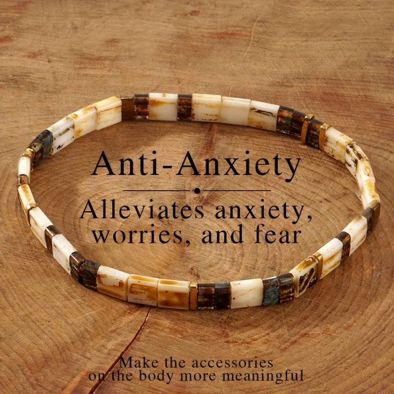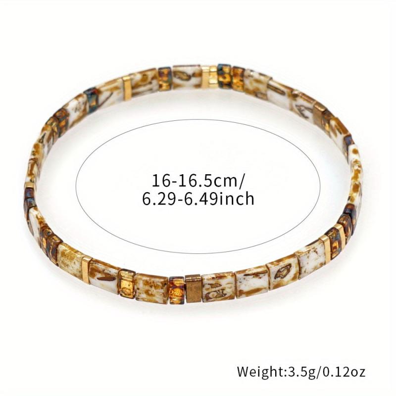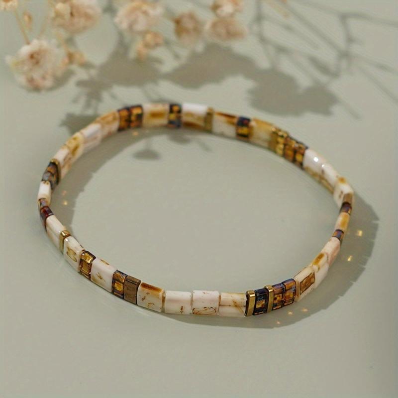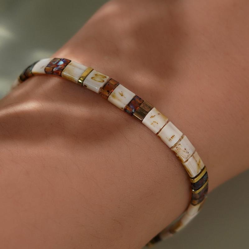 This Bohemian TILA stretch bracelet features natural stone and glass beads in cream and brown colors, making it the perfect gift for her to wear with casual attire.