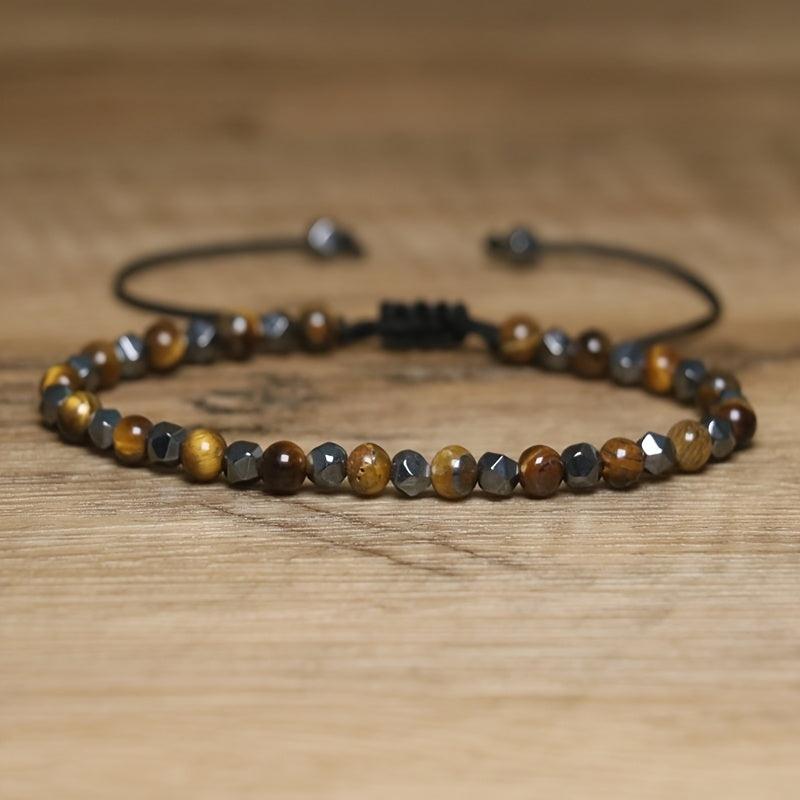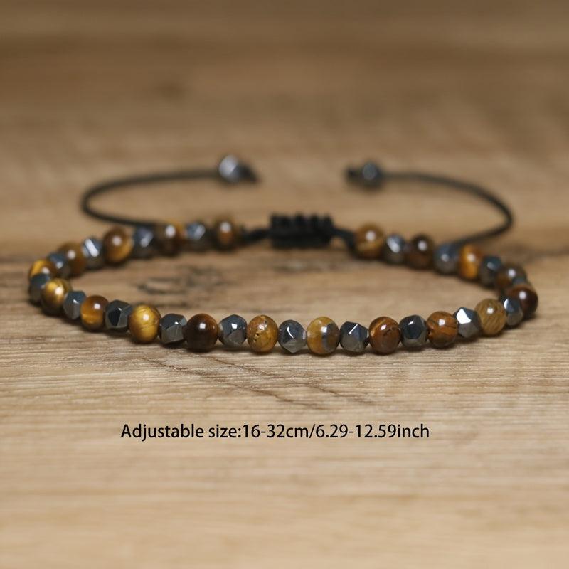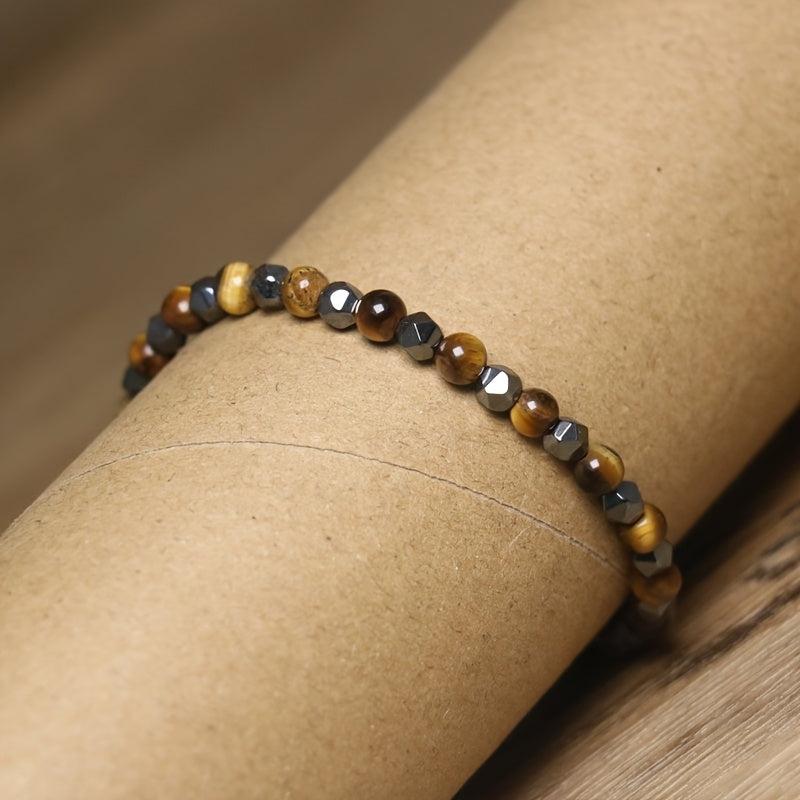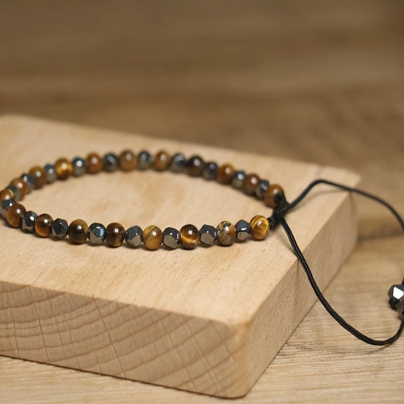 This natural stone bracelet features golden brown and dark gray Tiger's Eye gemstones in an asymmetric beaded design. It is adjustable, making it suitable for women of all wrist sizes. The bracelet is secured with an elastic cord closure, adding a touch of bohemian elegance to any outfit.