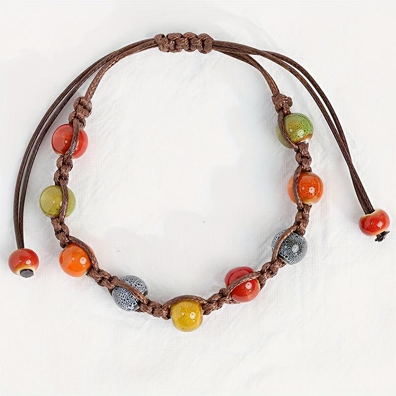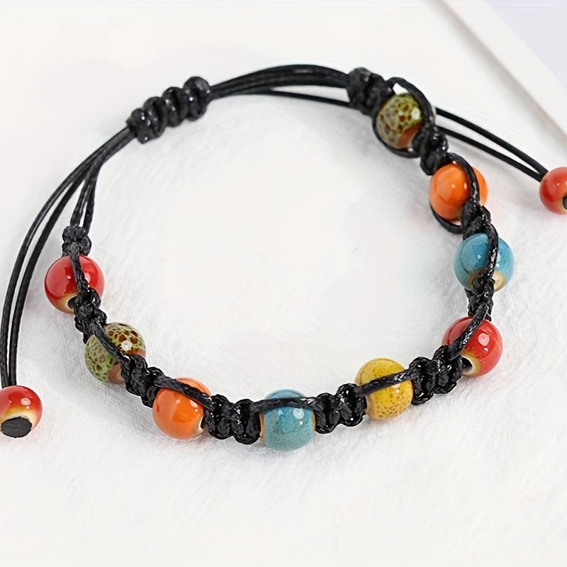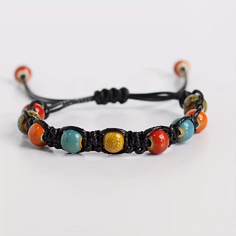 This handcrafted bracelet features a bohemian vintage style with hand woven ceramic beads, perfect for couples and friends. It is a unique tribal and earthy jewelry piece that can be worn daily.