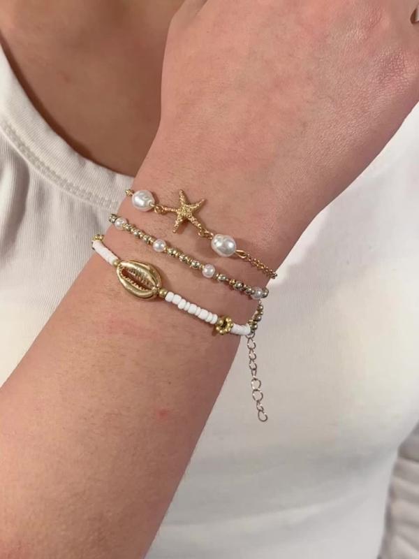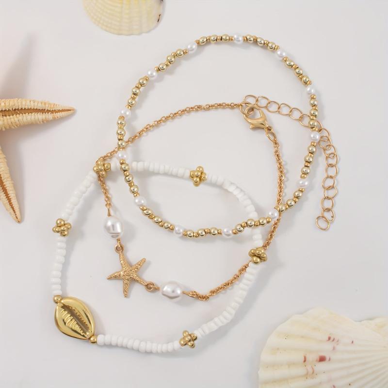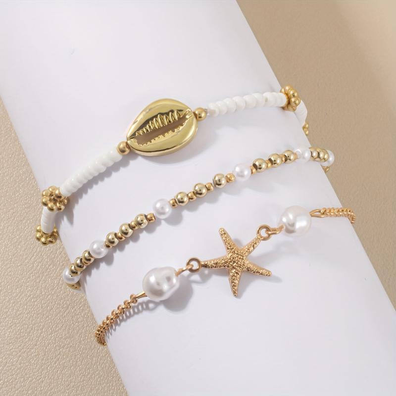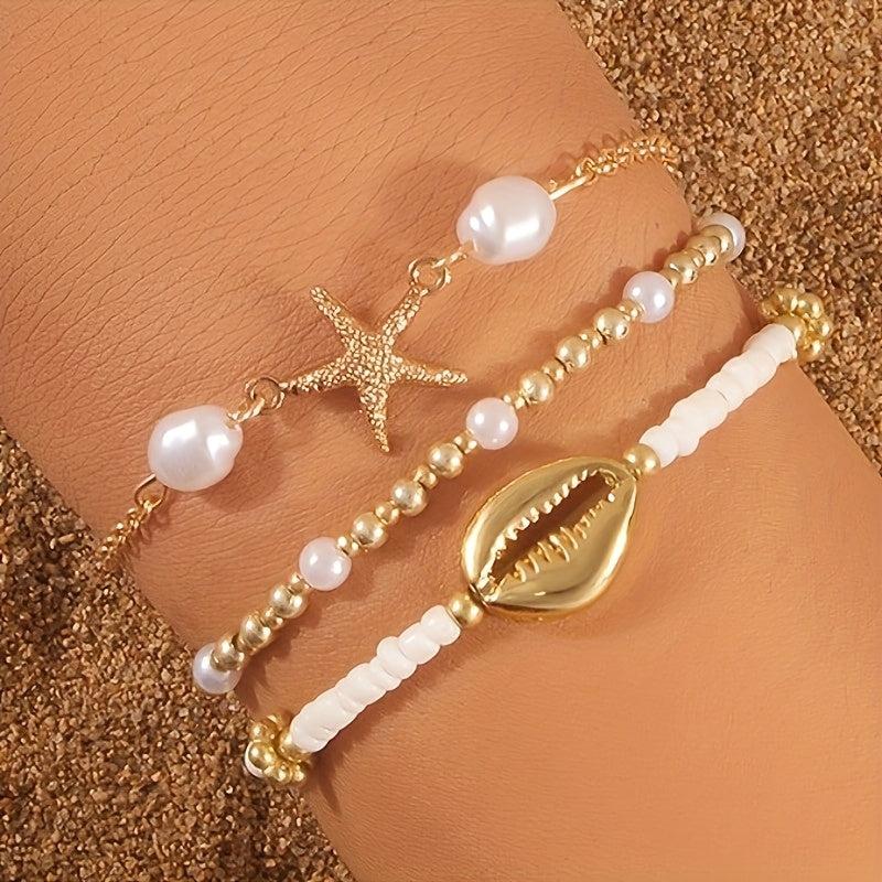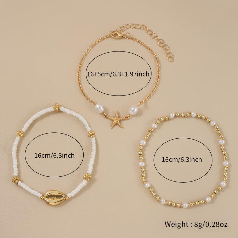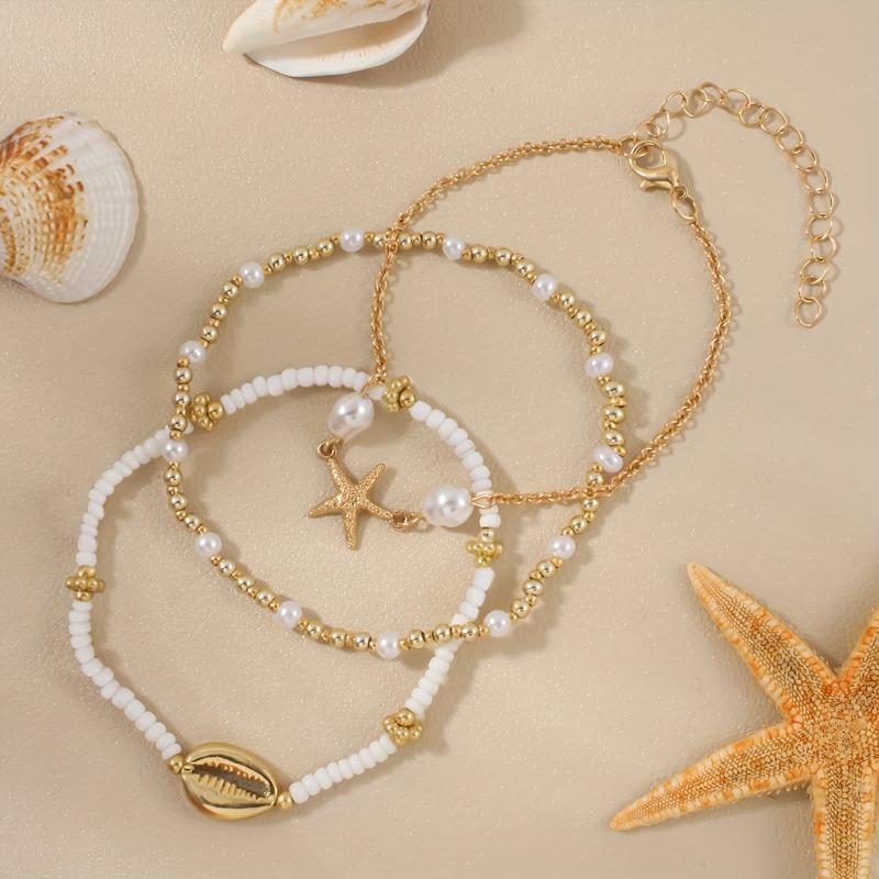 Elevate your beach party look with this set of 3 bohemian beaded bracelets featuring a delicate starfish and shell pendant. Perfect for a sexy and stylish statement.