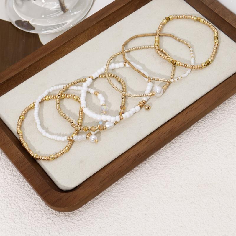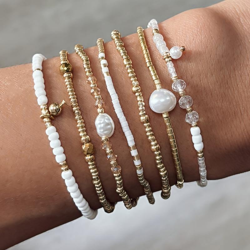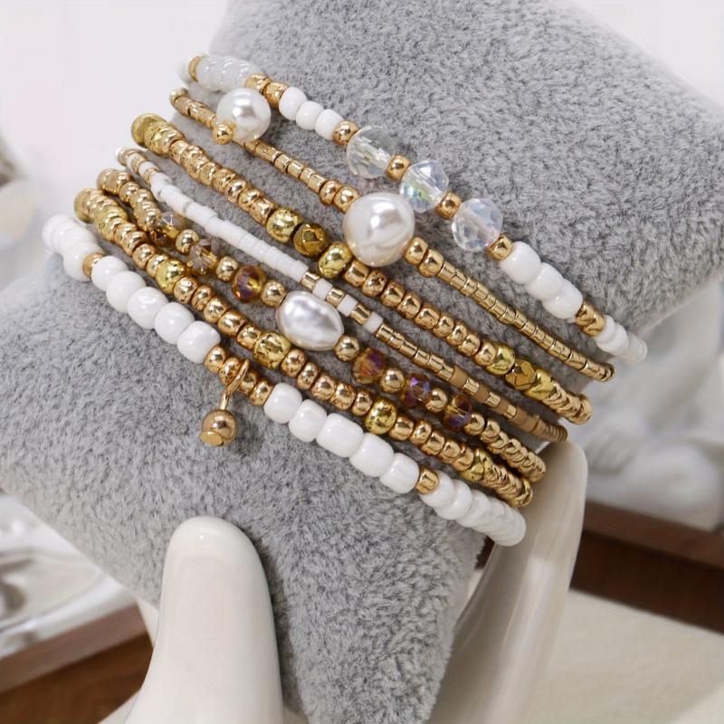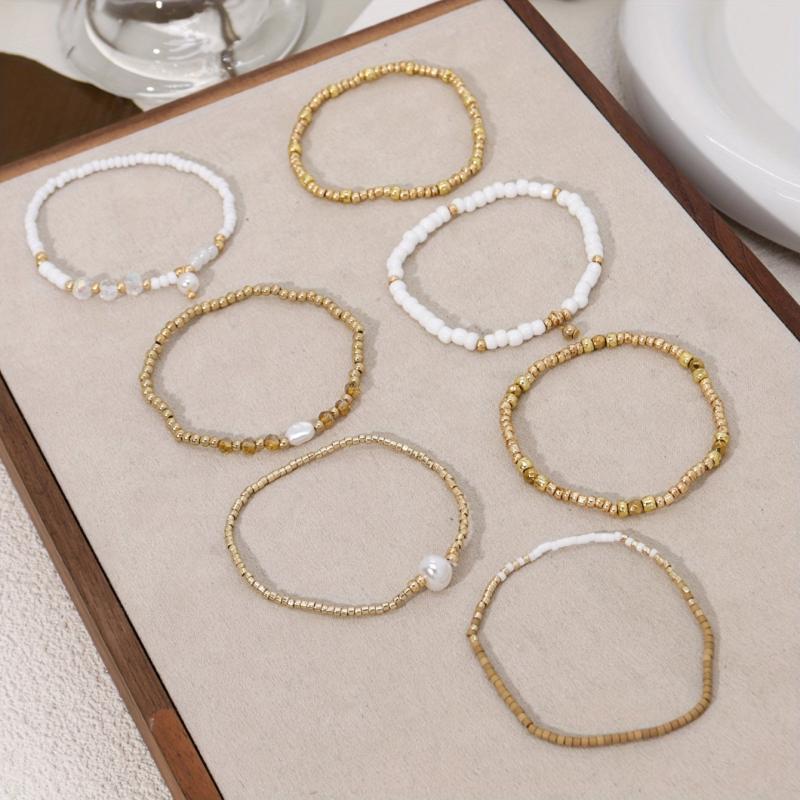 This 7-piece bohemian bracelet set features a mix of golden beads and colorful beads. The stretch design makes them easy to stack and wear. Ideal for adding a touch of boho chic to your vacation or party outfit. Makes a perfect holiday gift.