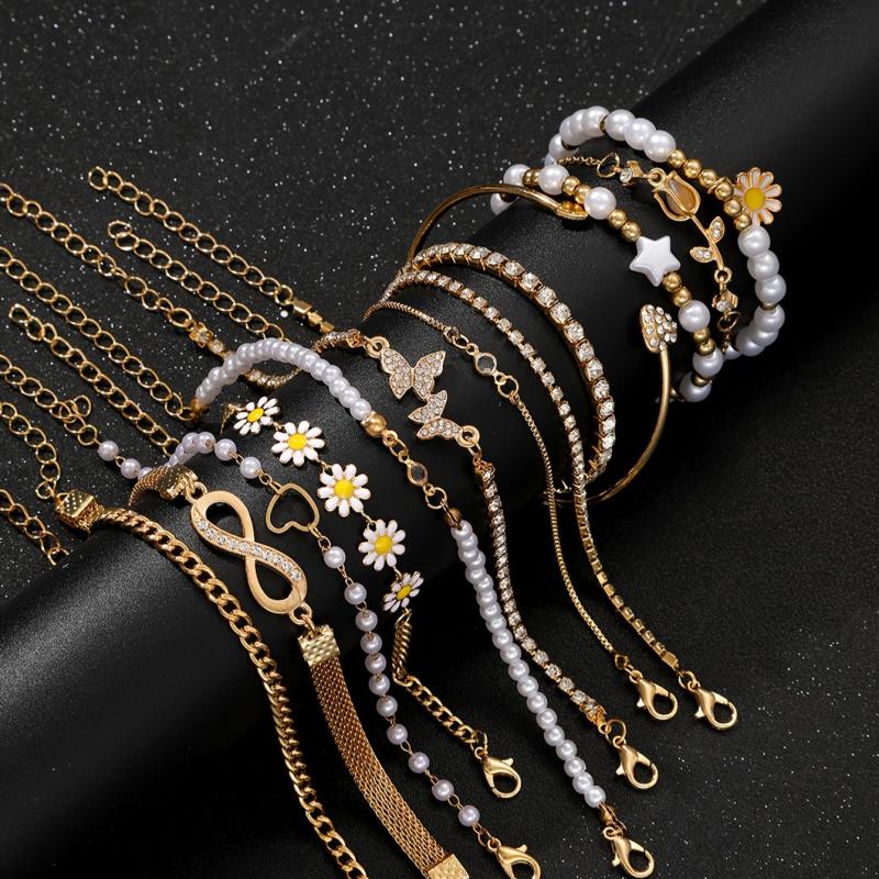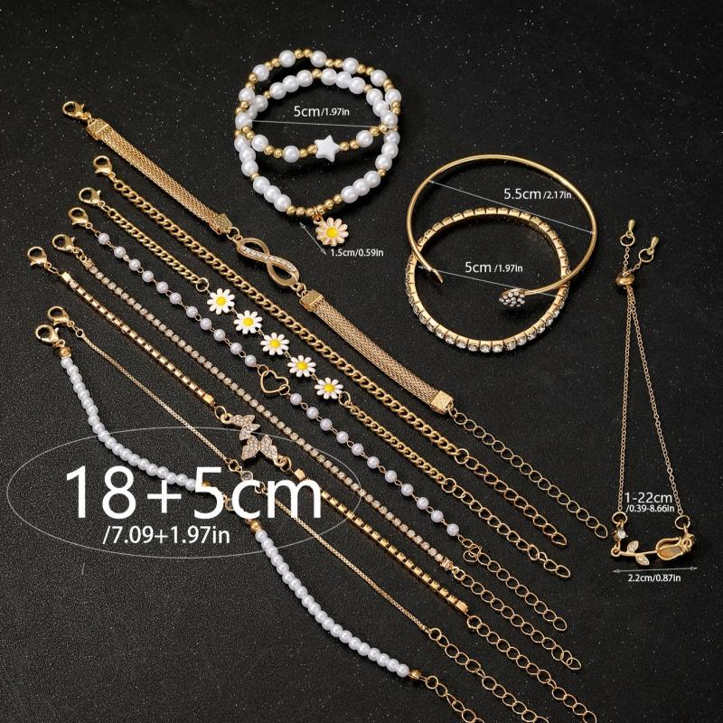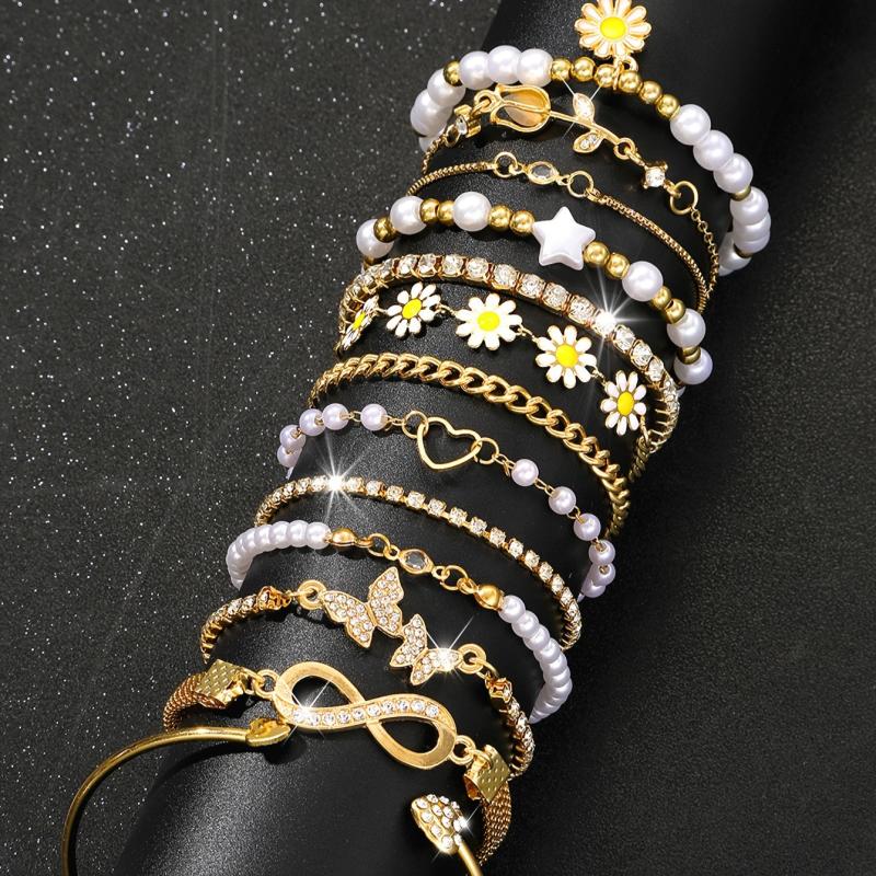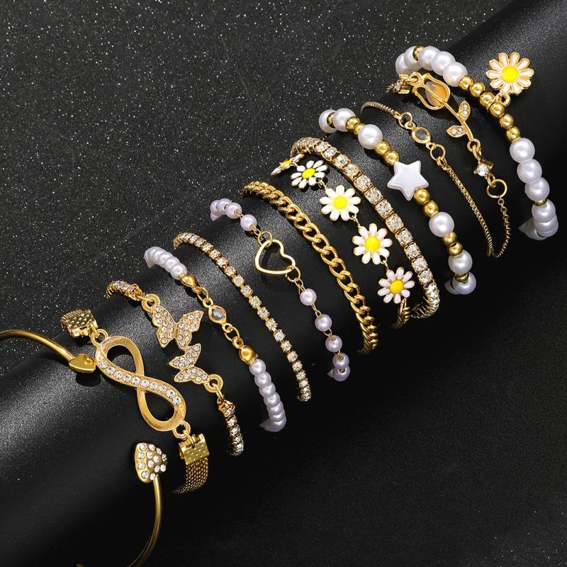 This 13pcs boho bracelet set features a mix of flowers, stars, butterflies, hearts, sparkling rhinestones, and geometric beads. Perfect for daily wear, parties, and more.
