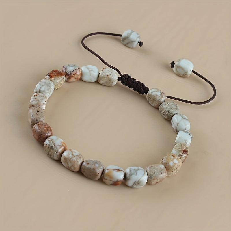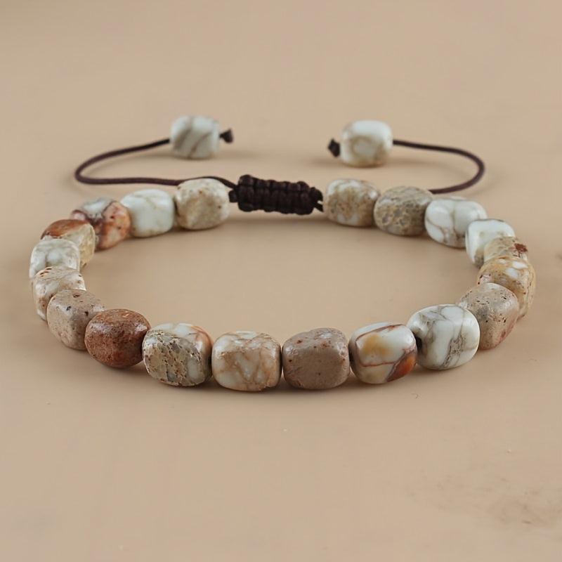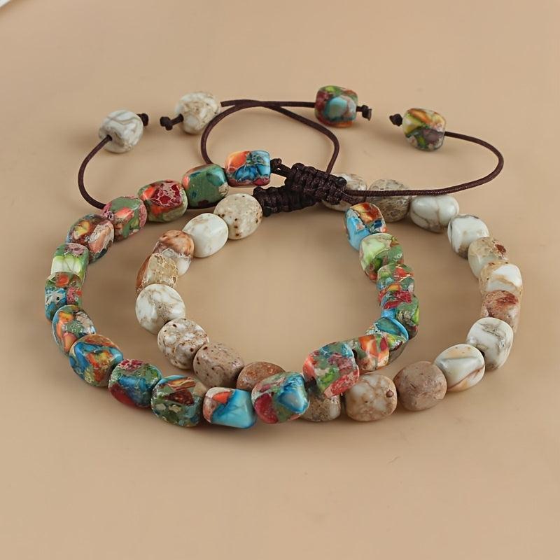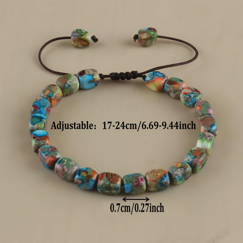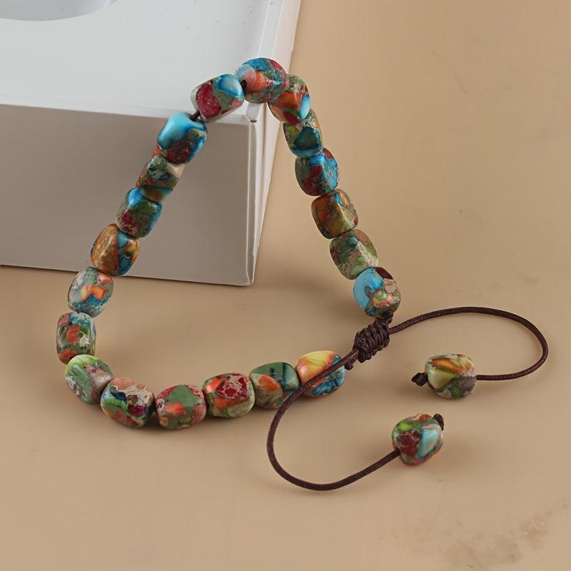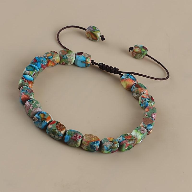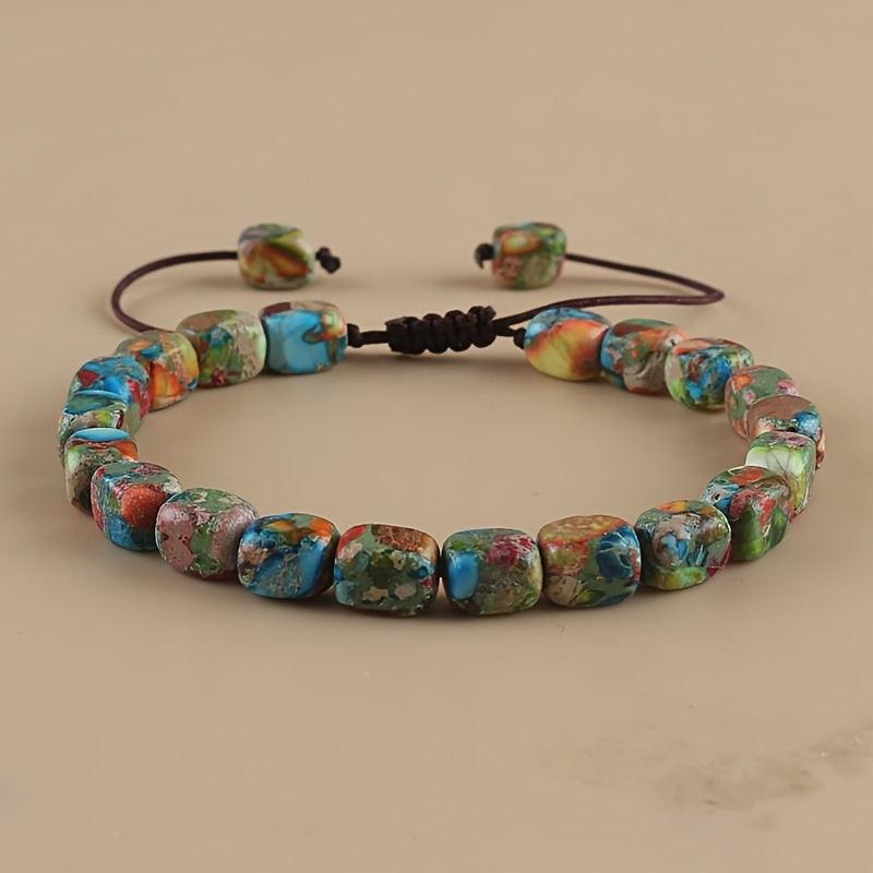 Add a pop of color to your look with this bohemian style gemstone bracelet. Handwoven with square emperor stones for a vintage touch.