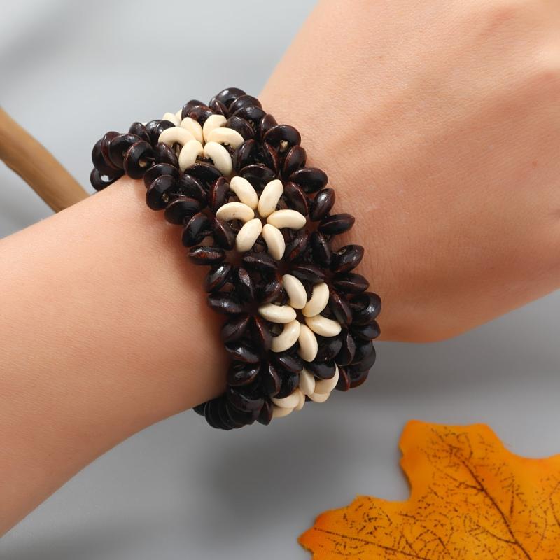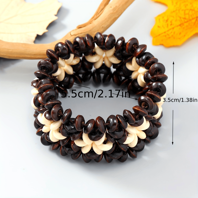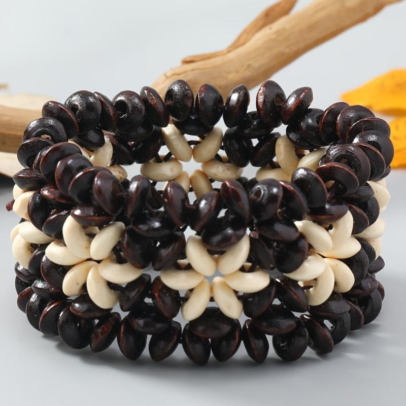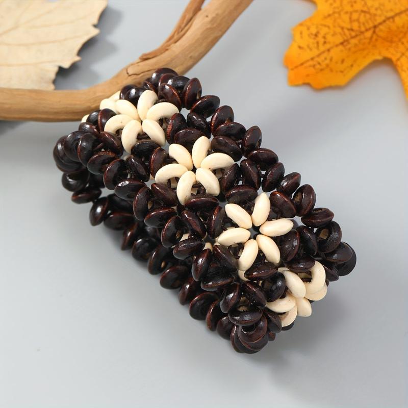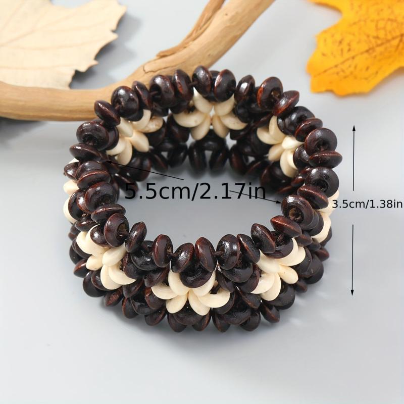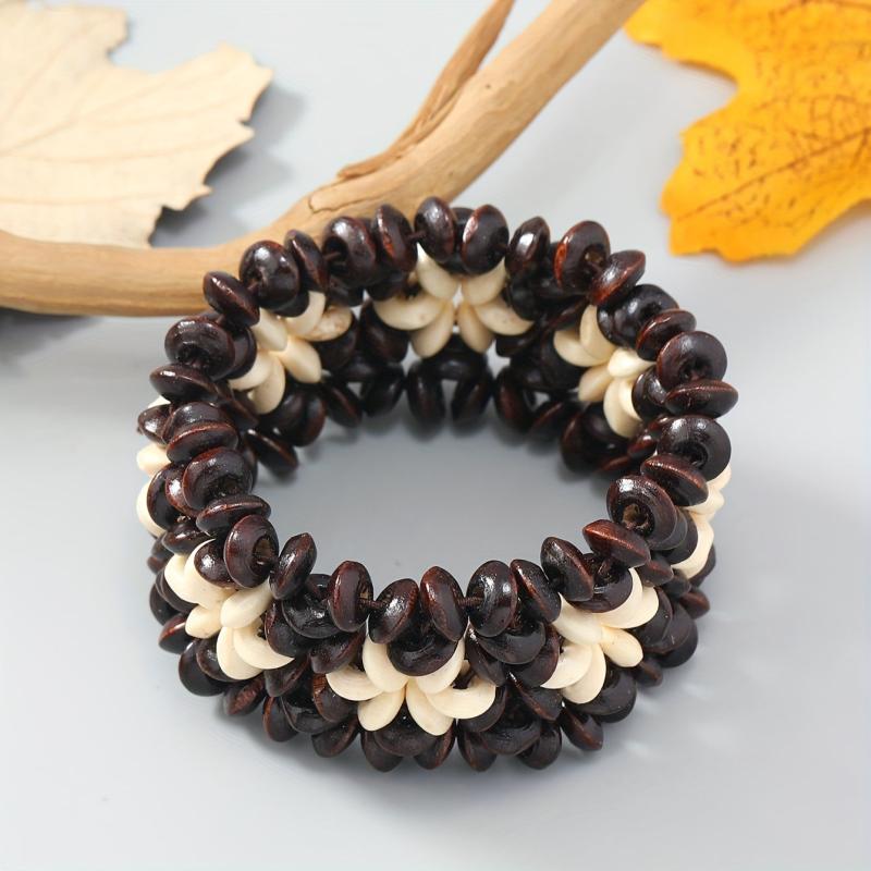 This bohemian bracelet features wooden beads and coconut shell for a vintage-inspired look. Perfect for casual attire and beach vacations, this stretch fit accessory adds a touch of boho charm to your outfit.