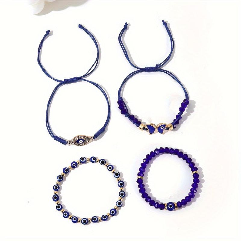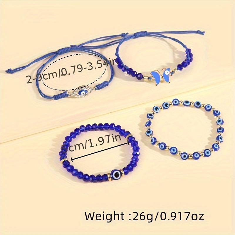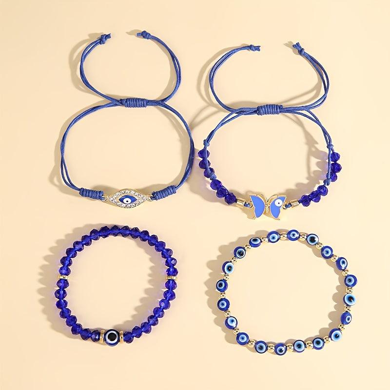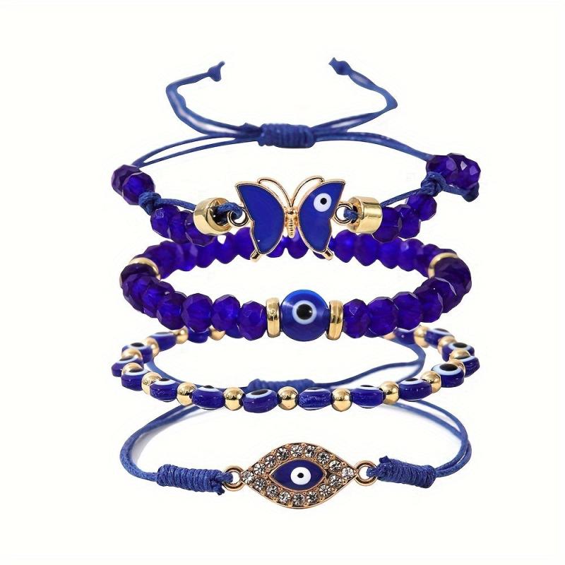 This set features 4 Boho Tribal style bracelets with Evil Eye and Butterfly charms. Perfect for daily wear or parties, these stackable bracelets are hand woven with acrylic beads and friendship bracelet.