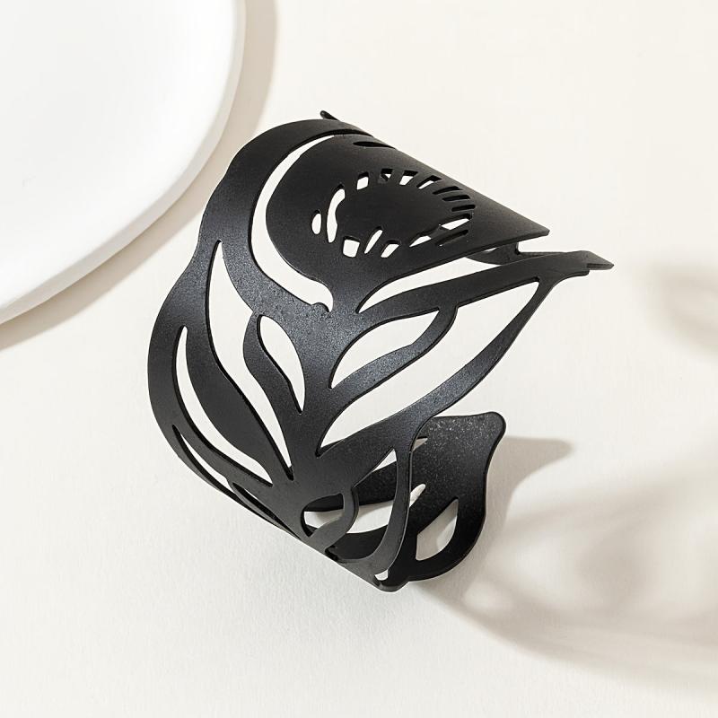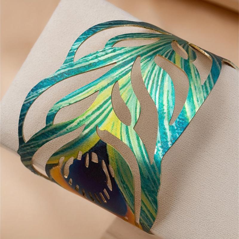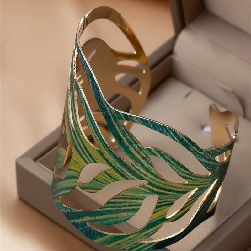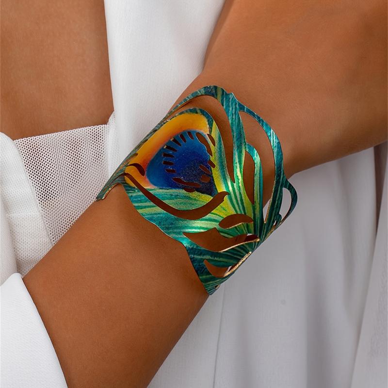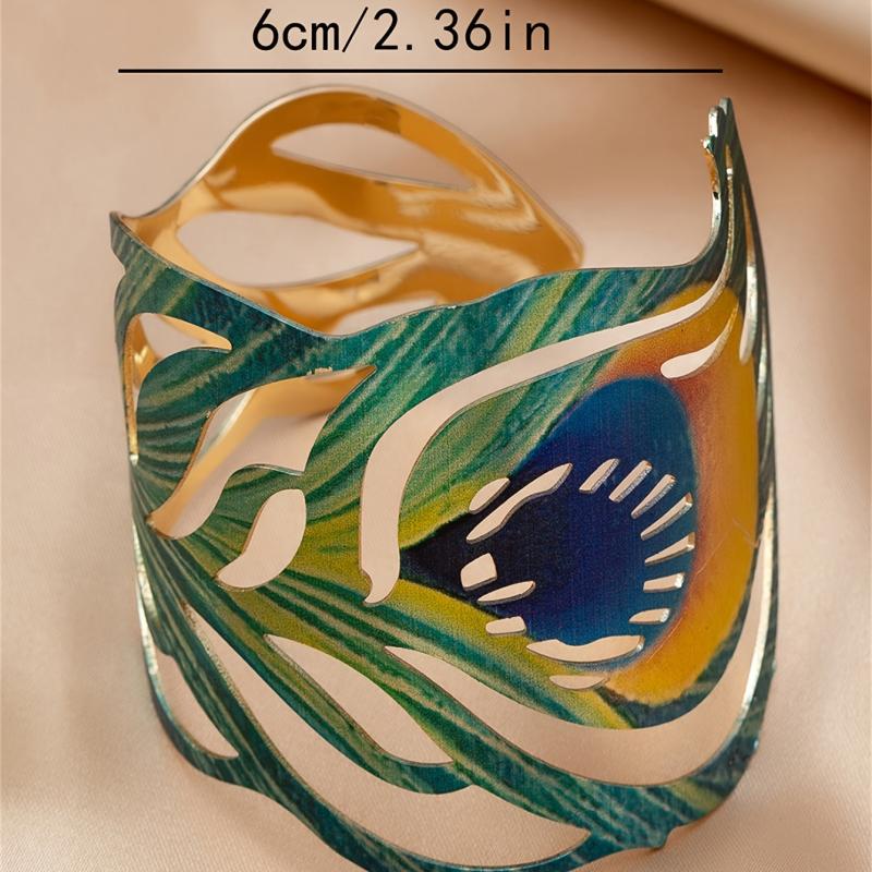 Add a touch of bohemian style with this retro peacock feather print open bracelet.