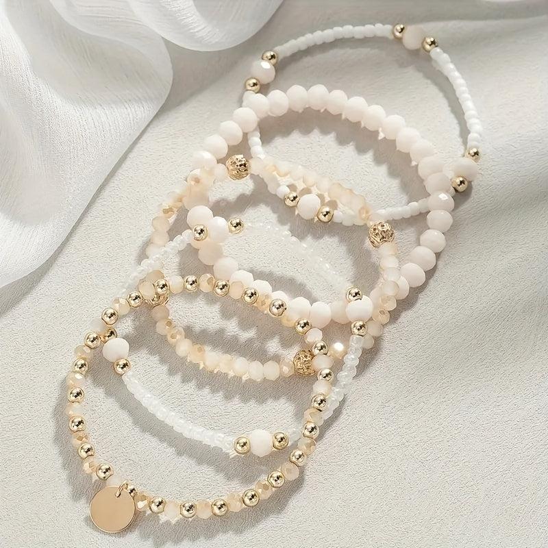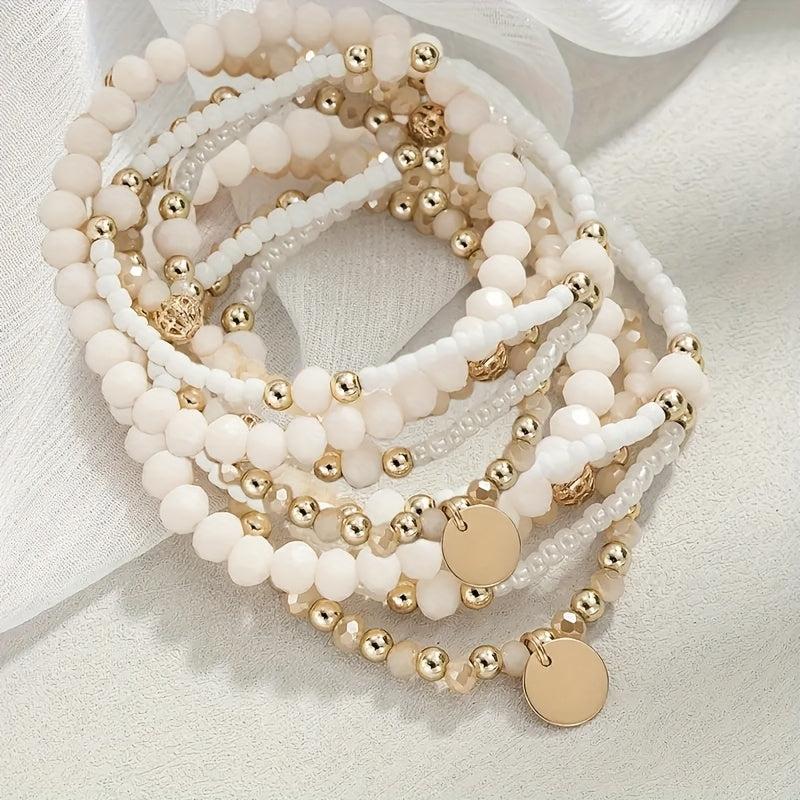 Add a touch of bohemian style with this bracelet set featuring 10 pink beads and round pendant charms. Perfect for everyday wear.
