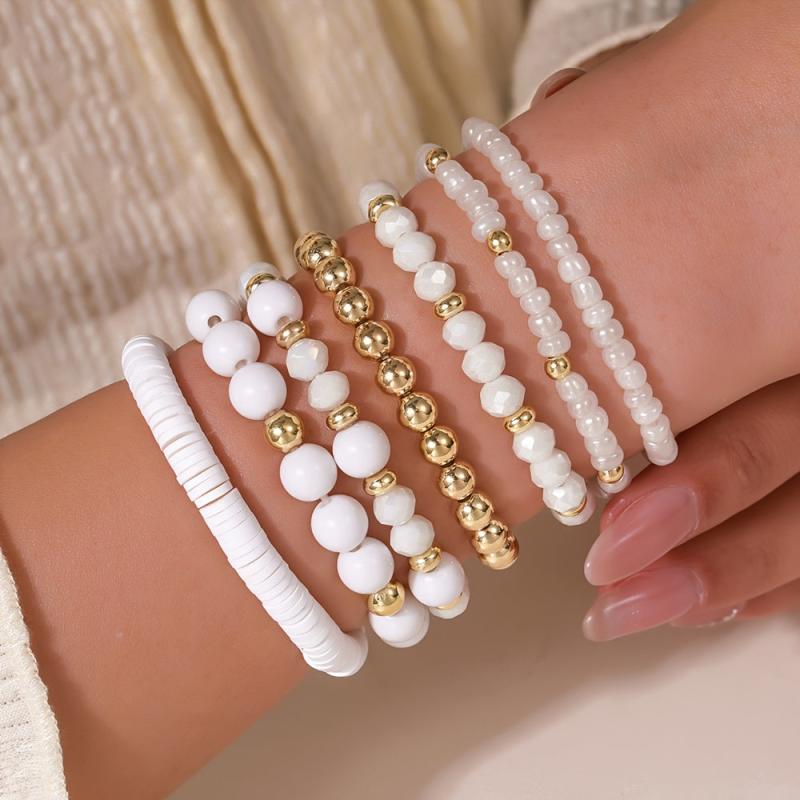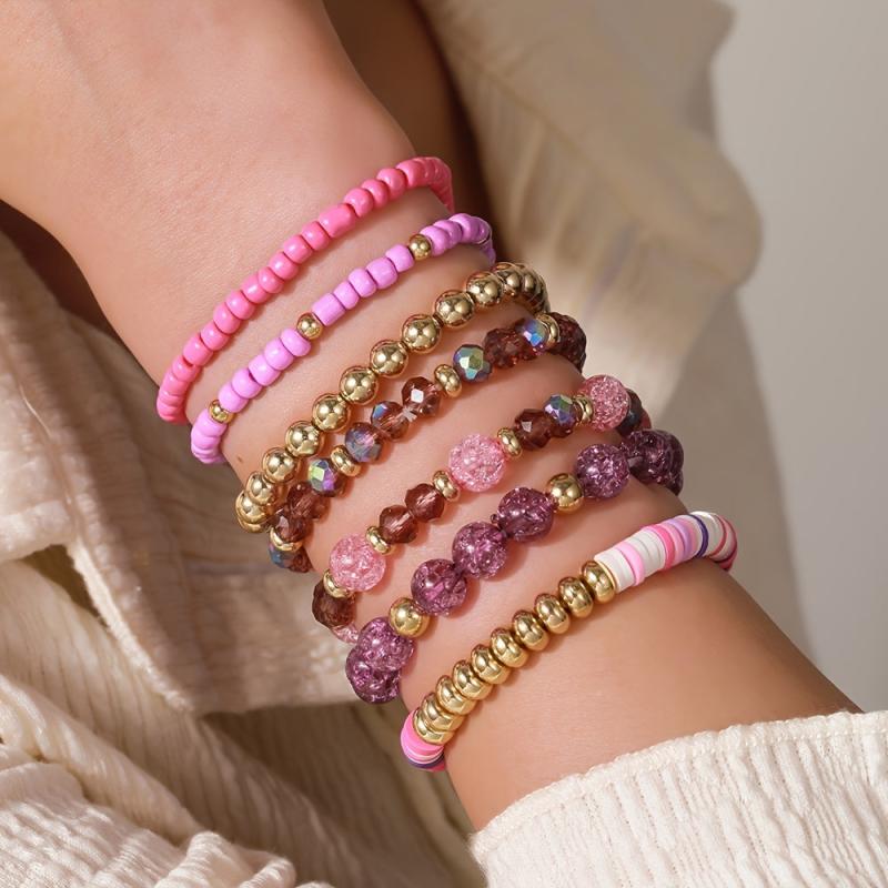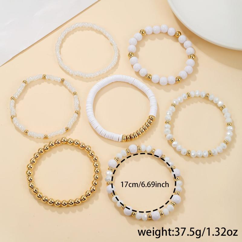 Enhance your beach vacation or casual outfit with this 7pcs Boho & Polymer Clay Beaded Bracelet Set. The versatile accessory adds a touch of Boho style to your look.