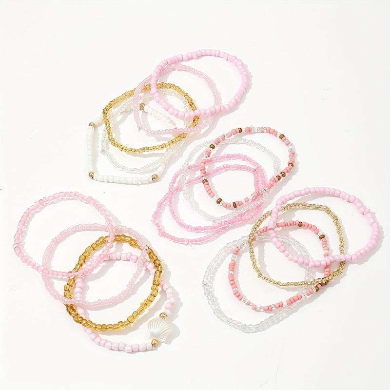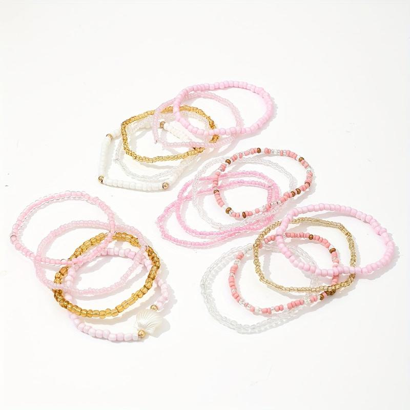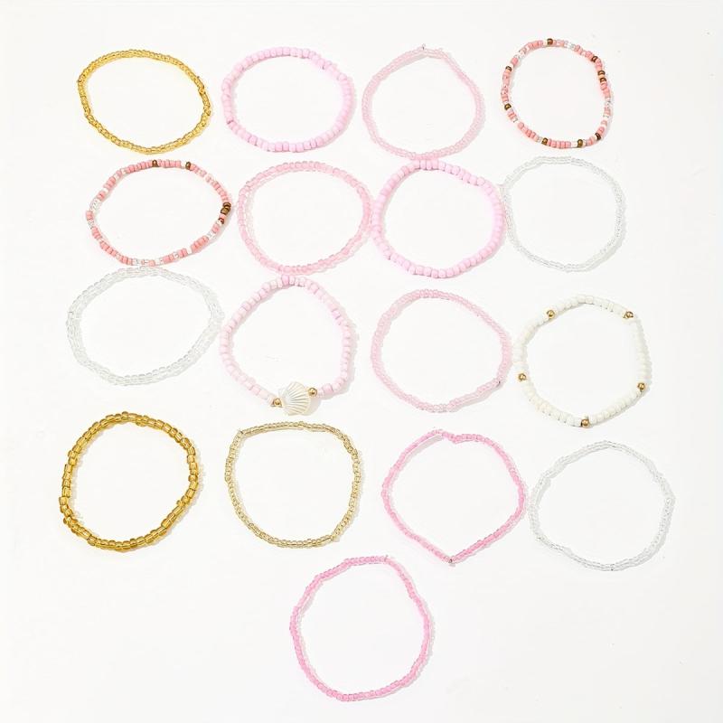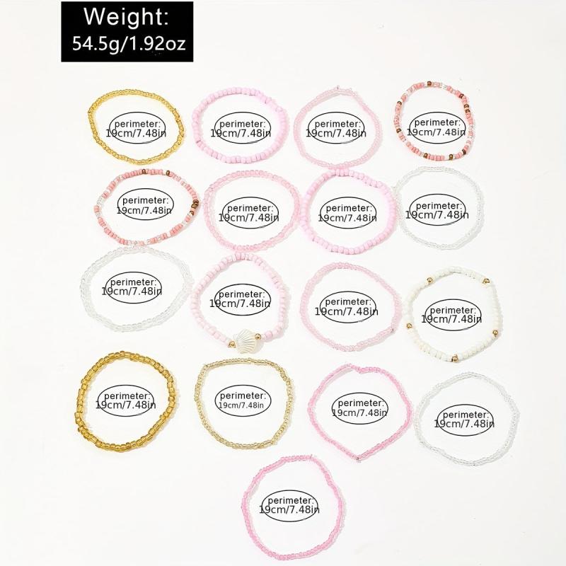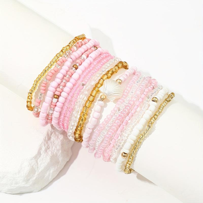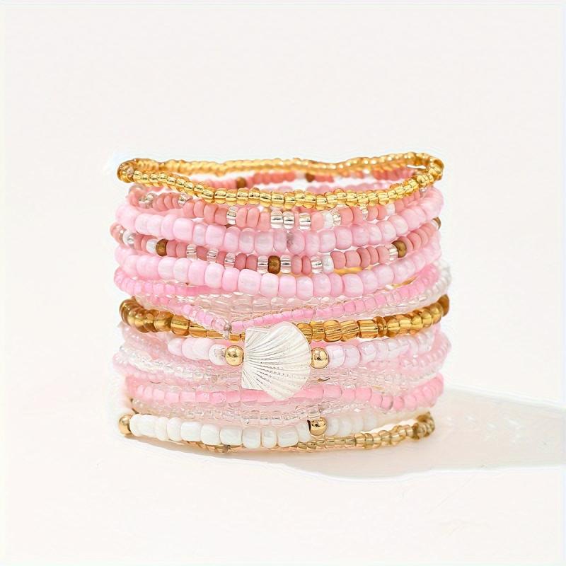 This 17-piece bohemian style bracelet set features shell beads and pink charms on elastic bands. Mix and match to create your own unique look. Perfect for women who love a pop of color and a touch of boho chic.