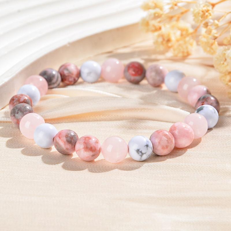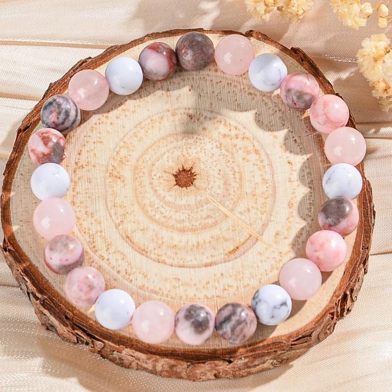Handcrafted bracelet with smooth polished natural stone beads in pink and gray. Ideal for daily wear and gifting.