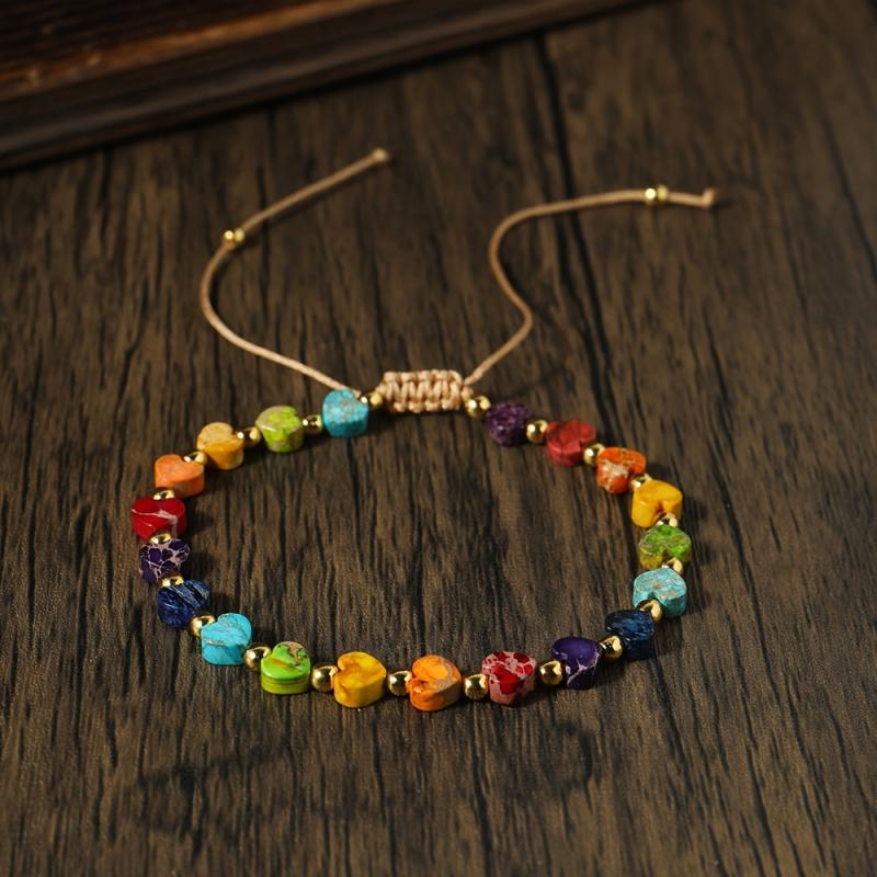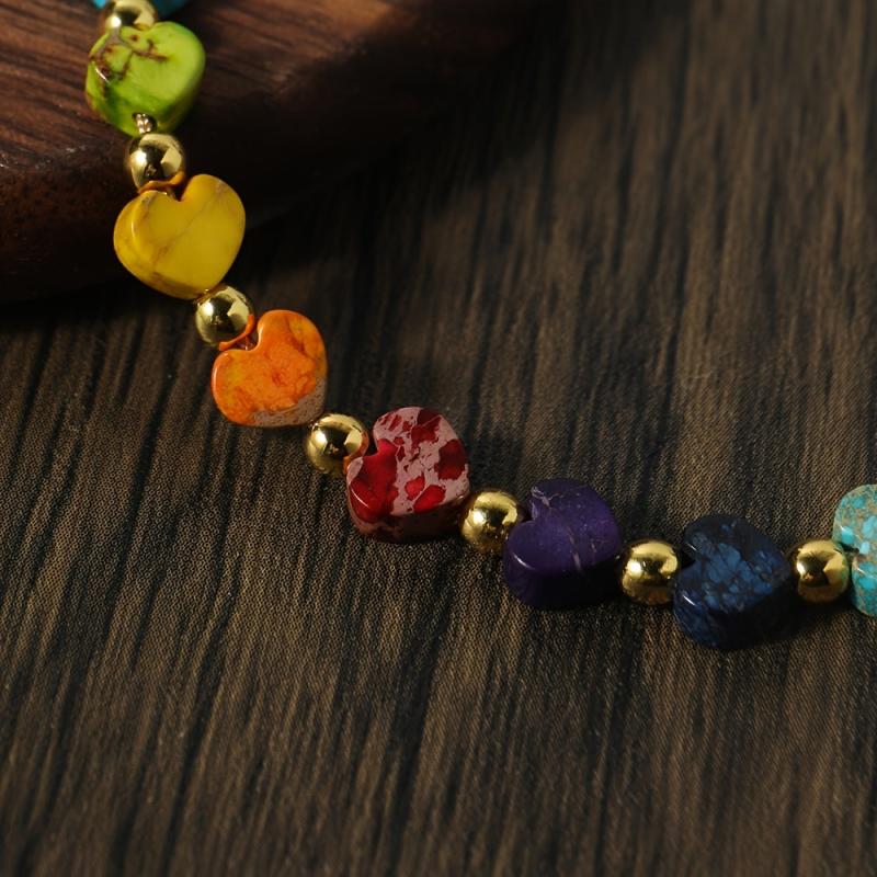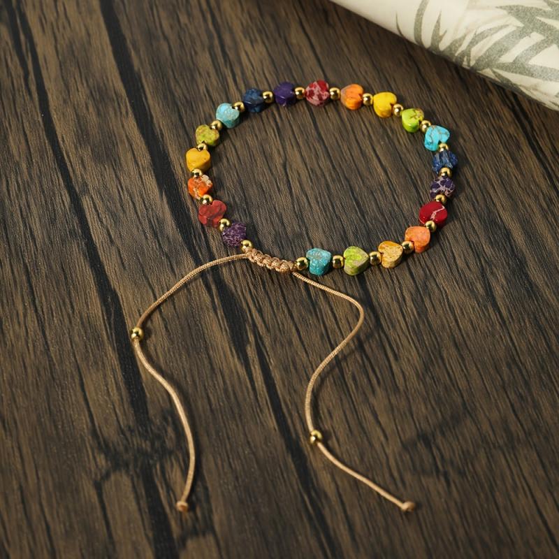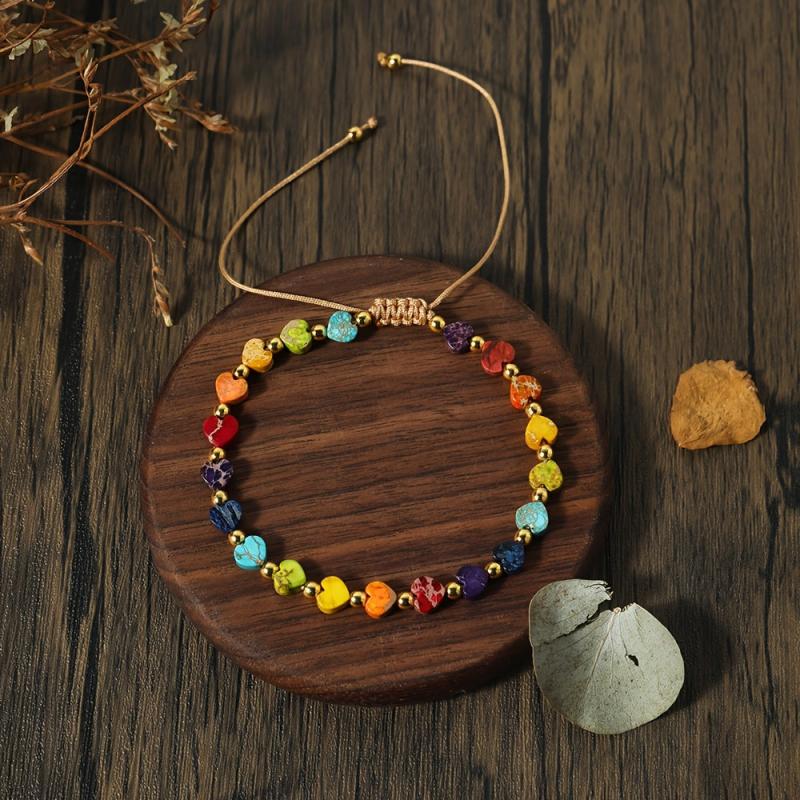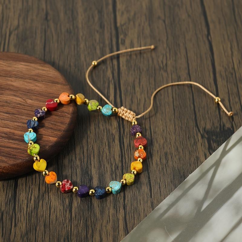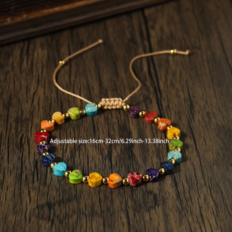 Enhance your bohemian style with this colorful natural stone bracelet featuring heart beads and a golden accent. The braided design adds a trendy touch while the adjustable size ensures a comfortable fit.
