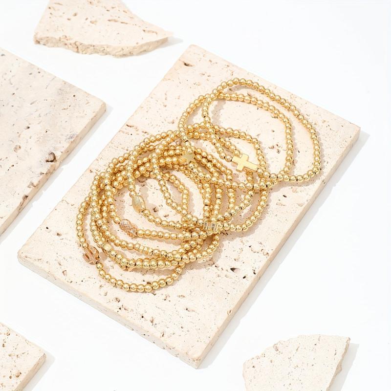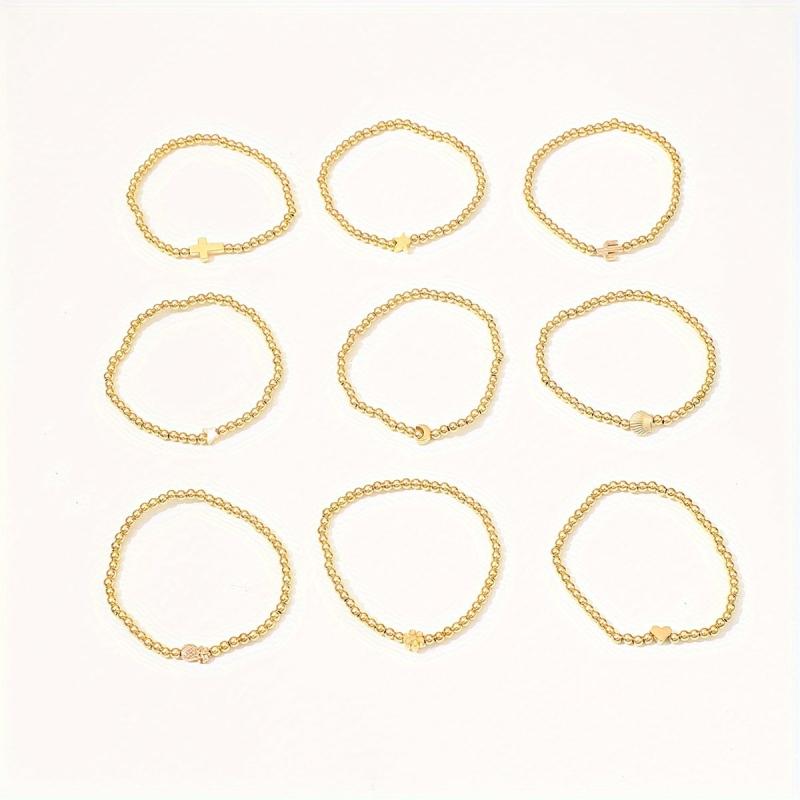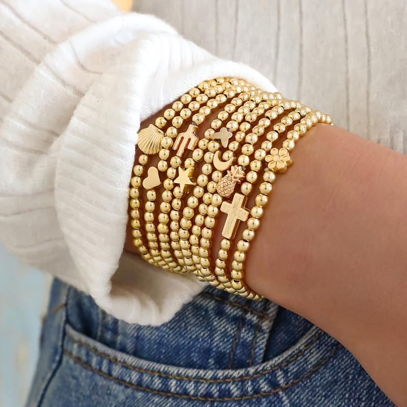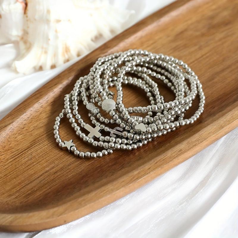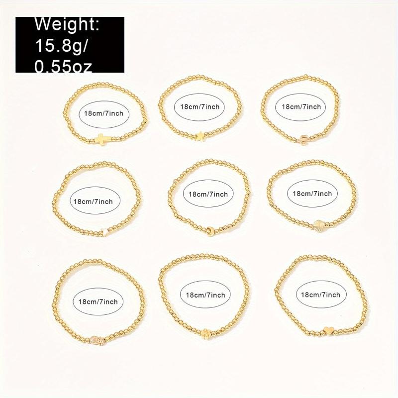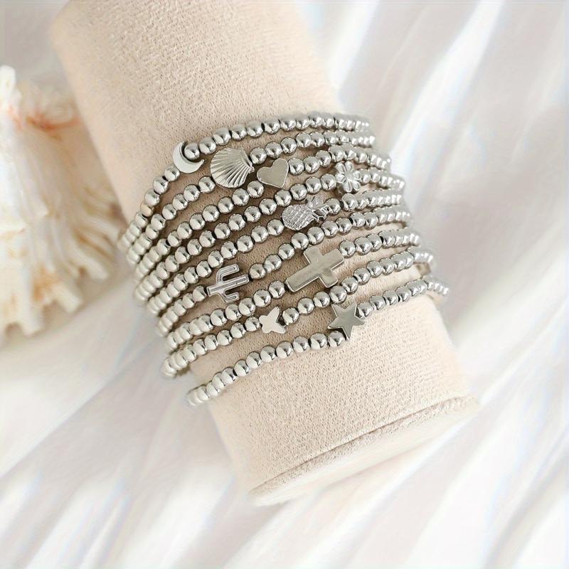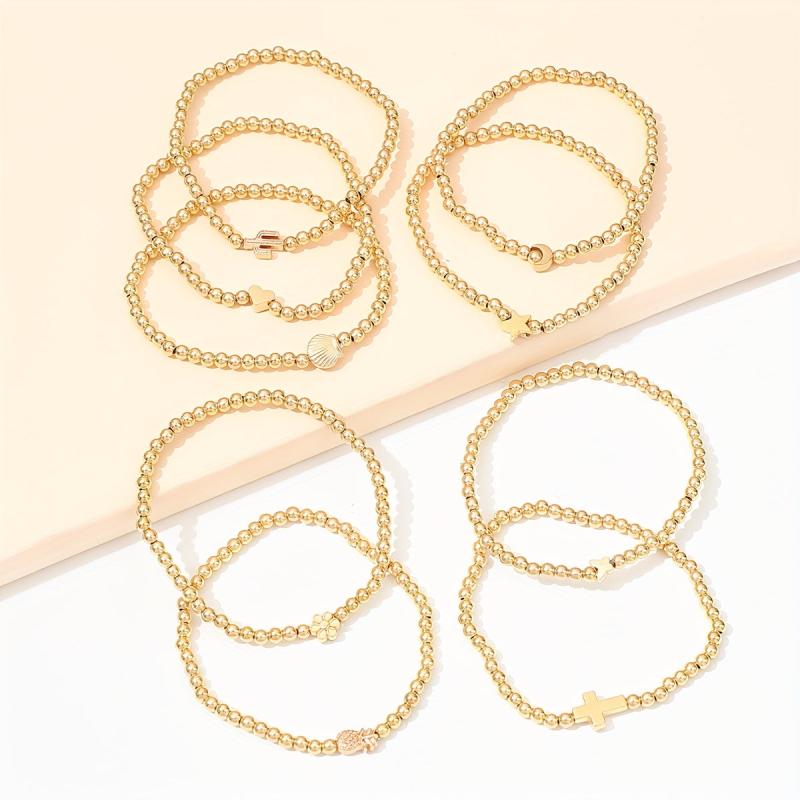 Express your bohemian chic style with this 9-piece bracelet set featuring a mix of moon, star, cactus, and flower charms made of CCB shell. Perfect for beach or casual wear.