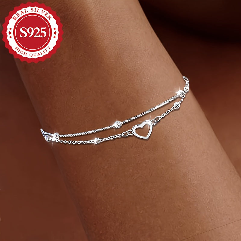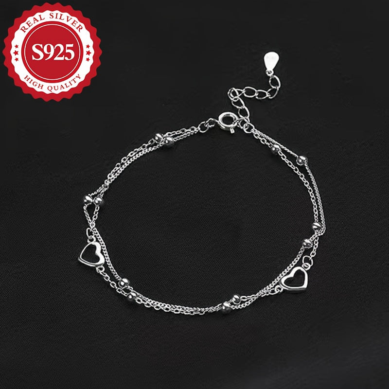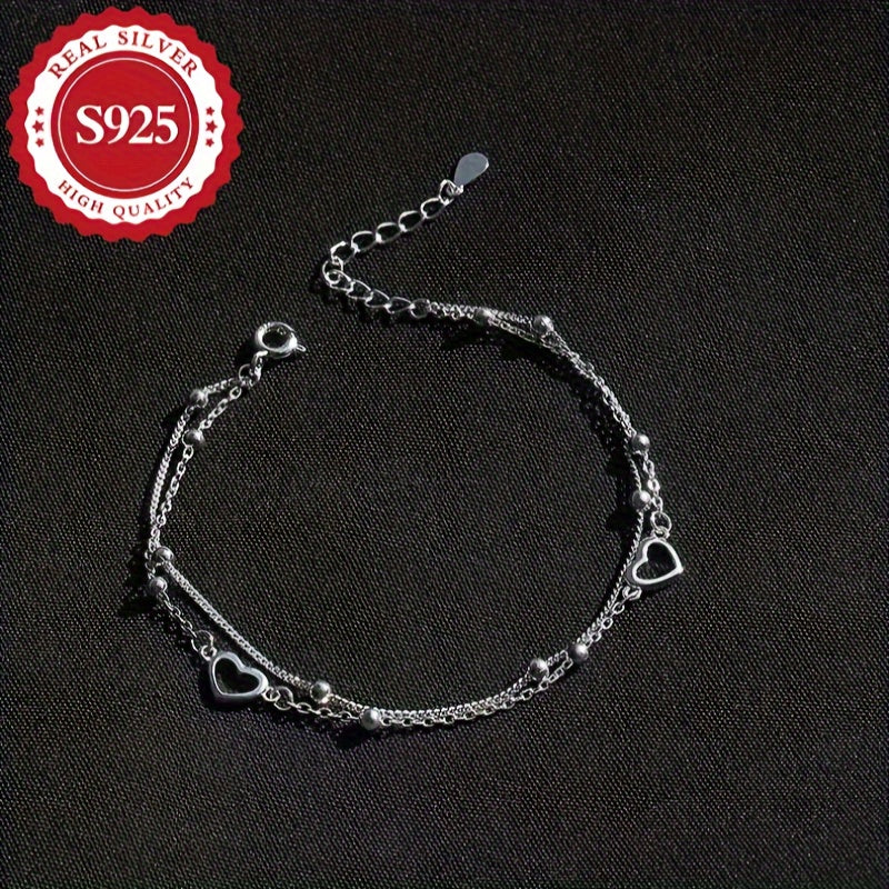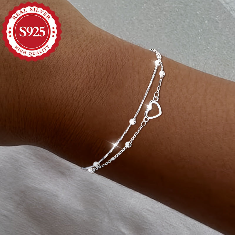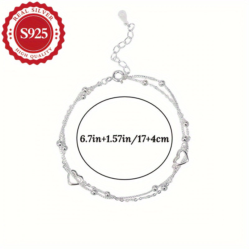This S925 sterling silver bracelet features a boho style design with double layers of beaded strands and a hollow heart charm. It is silver plated and hypoallergenic, making it a perfect Christmas gift for women.