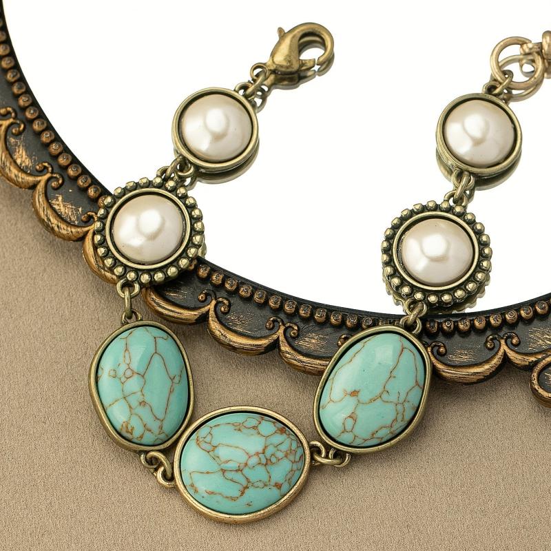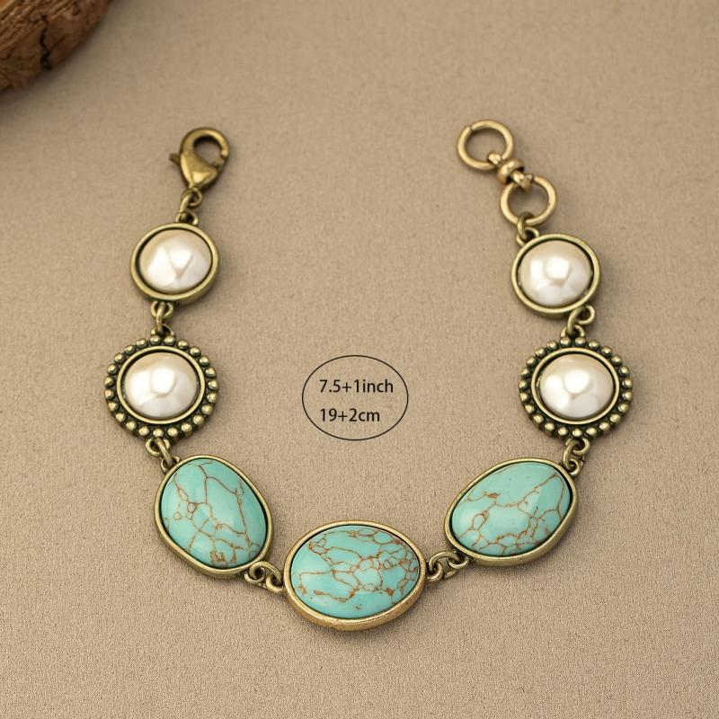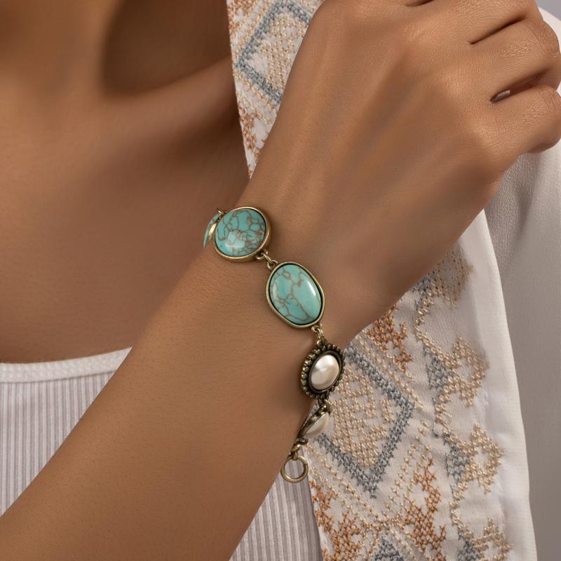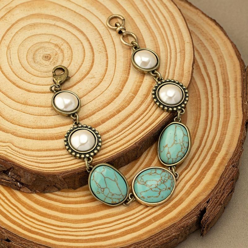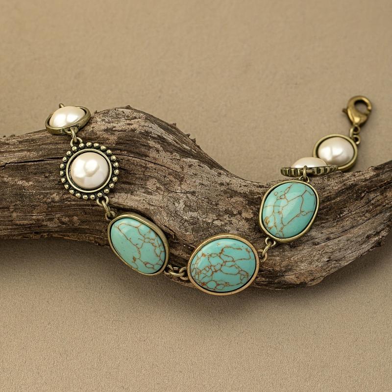 Elevate your holiday party look with this vintage bohemian bracelet featuring turquoise and faux pearls. Perfect for adding a touch of chic to any outfit.