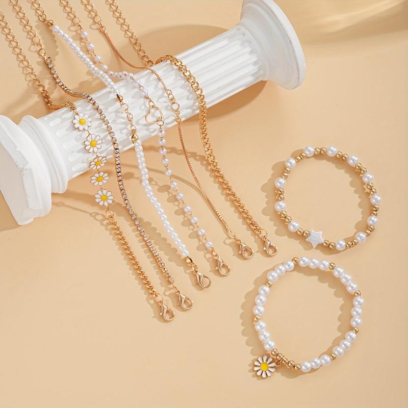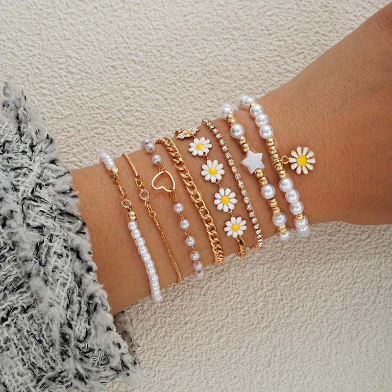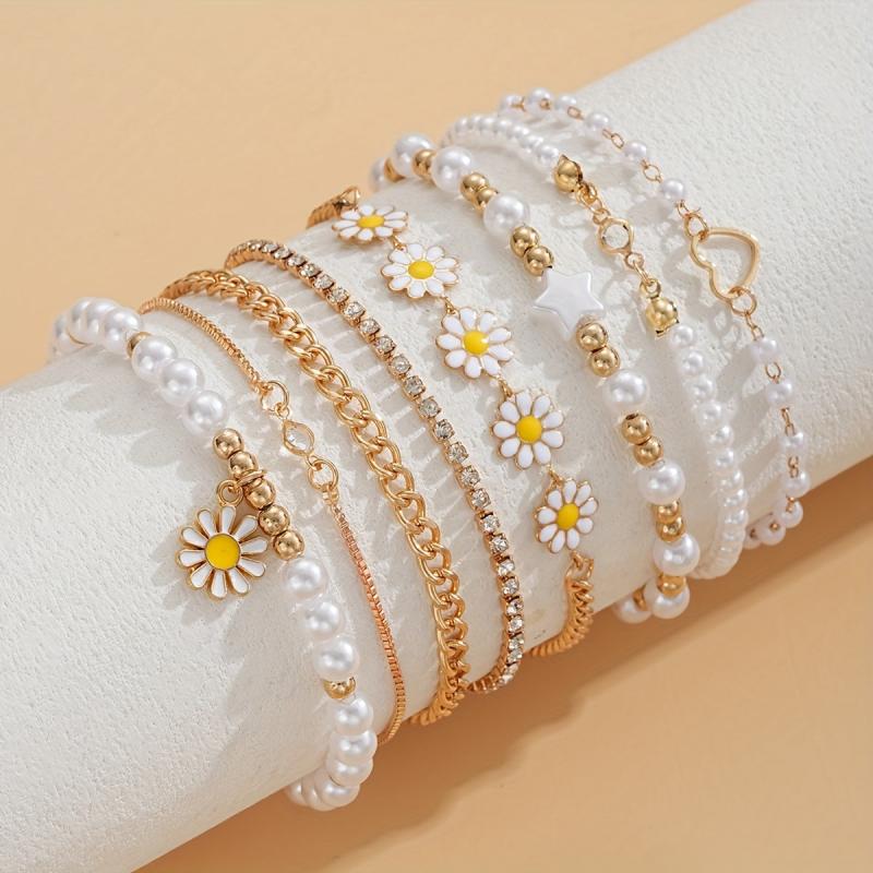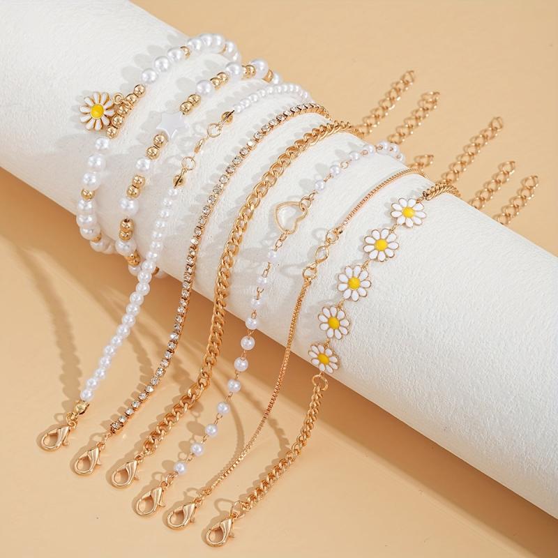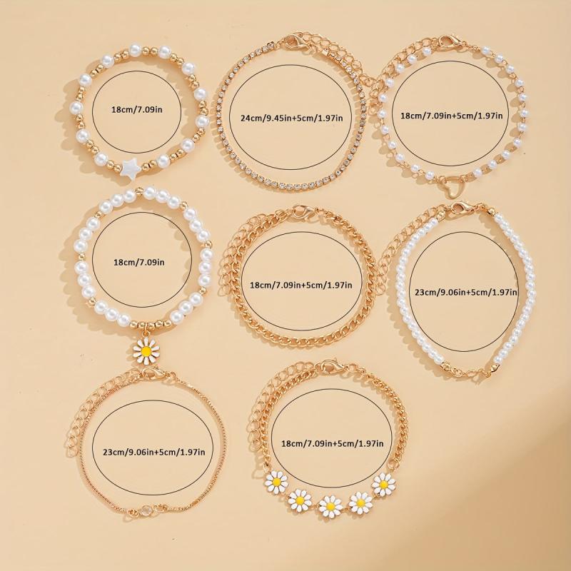 Add a touch of bohemian chic to your style with this 8-piece bracelet set featuring daisies, rhinestones, faux pearls, stars, and hearts. Perfect for vacation, dates, parties, or casual daily wear. The golden chain layers are adjustable.