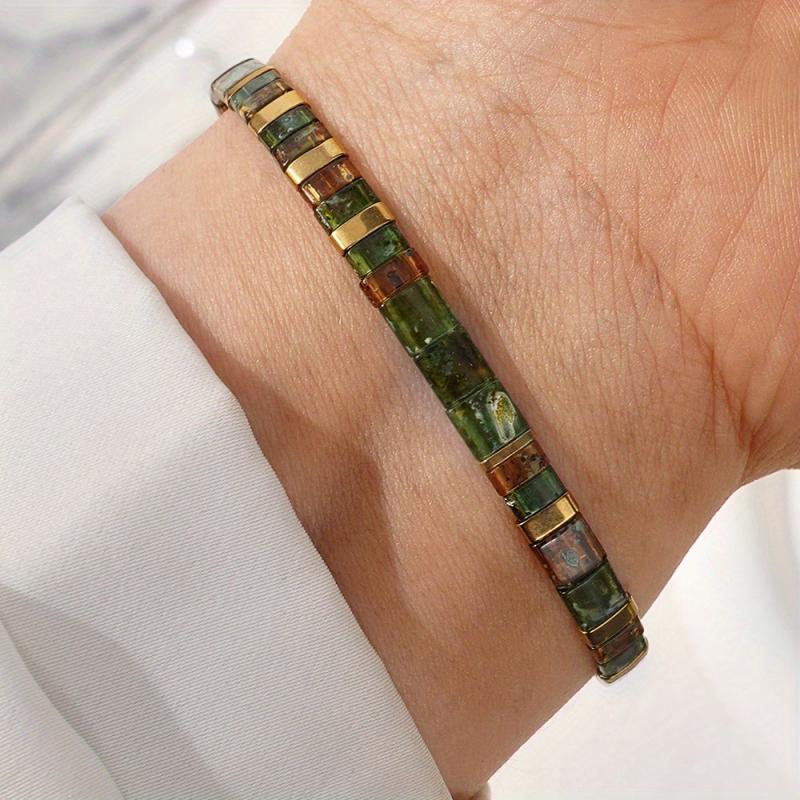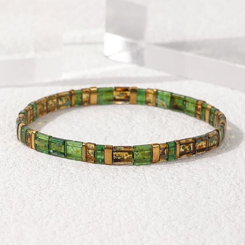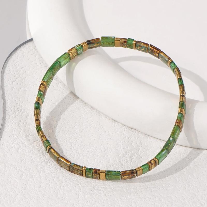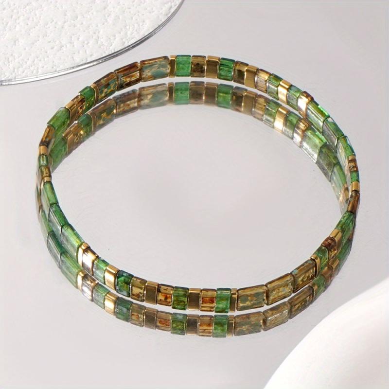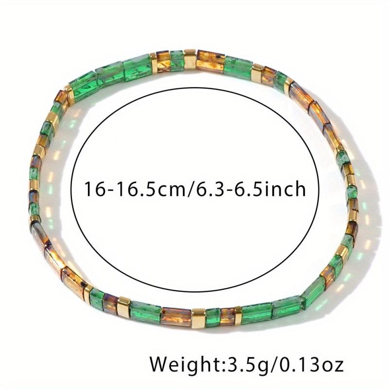 Handcrafted bracelet perfect for beach parties and casual attire. Features vibrant green, yellow, and orange glass beads in a bohemian style.