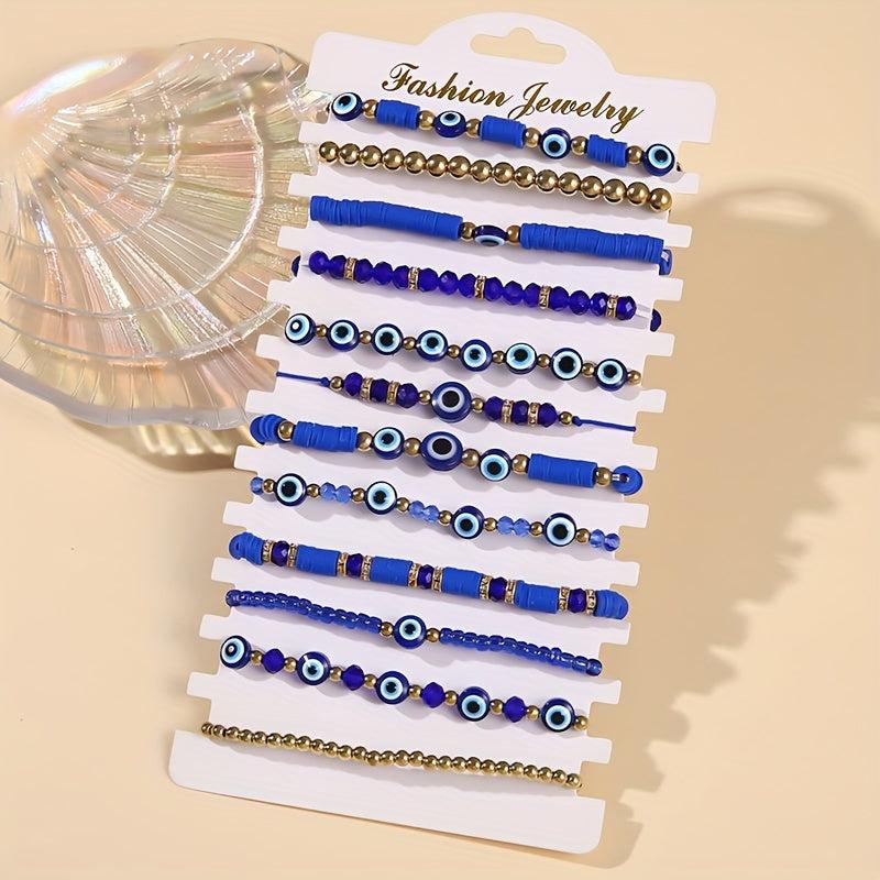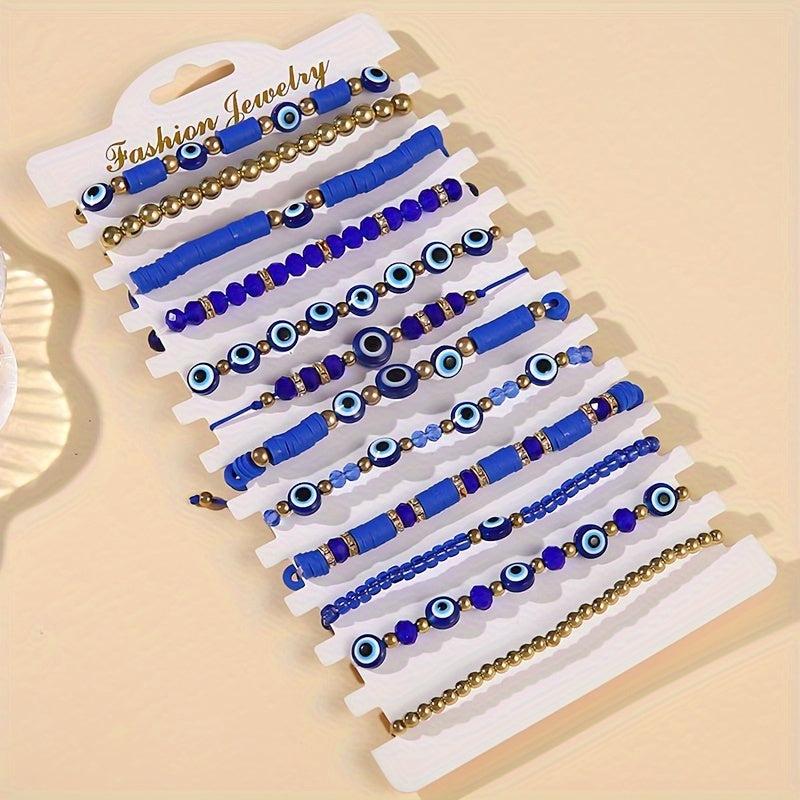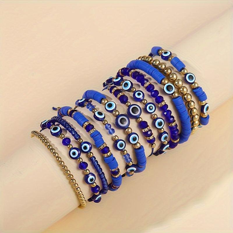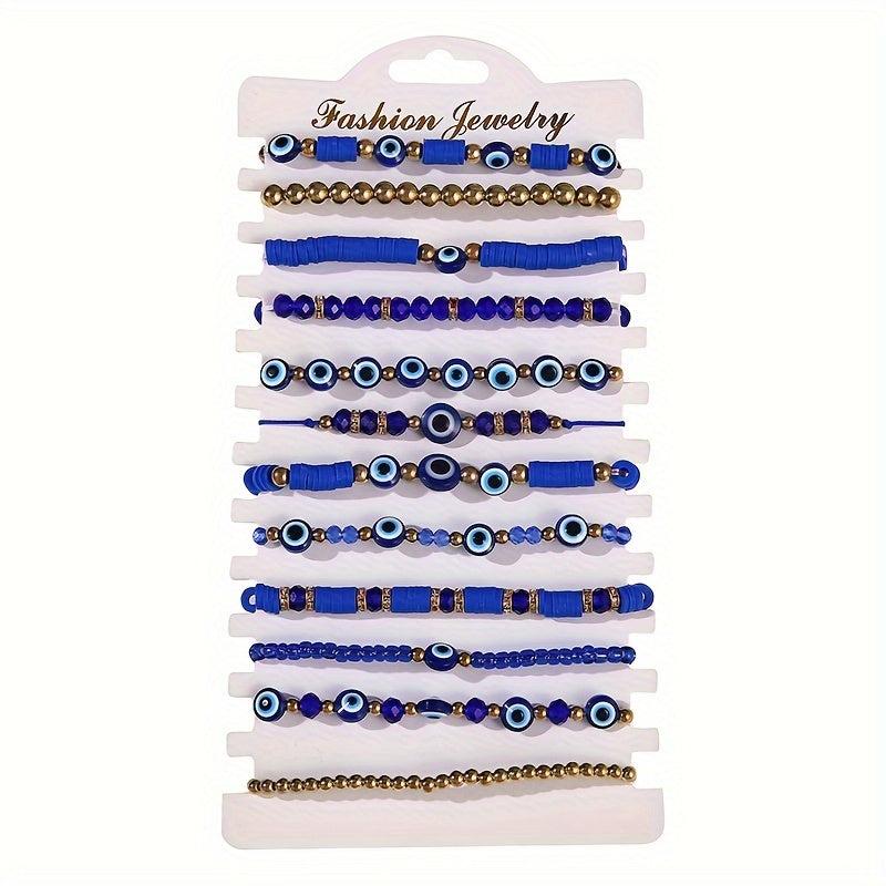 This bracelet set features a boho tribal inspired design with polymer clay evil eye beads. It includes 12 beaded bracelets suitable for daily wear or gifting occasions.