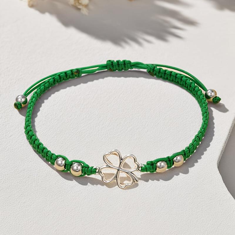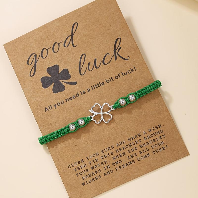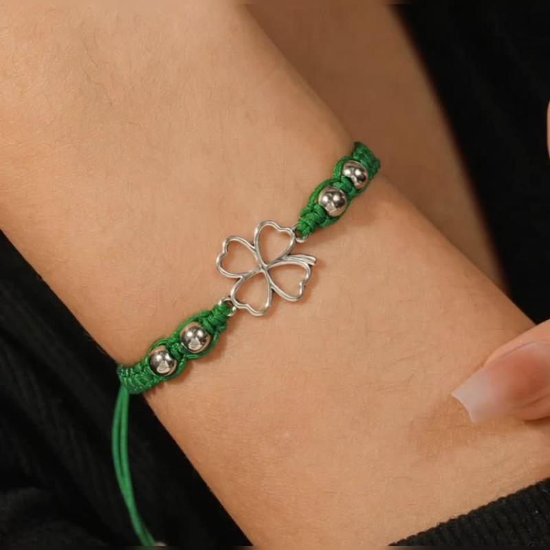 This adjustable green rope bracelet features a lucky clover charm, perfect for St Patrick's Day, friendship, and good luck wishes all year round.