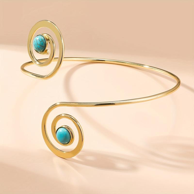 Add a touch of vintage charm with this bohemian open cuff arm bracelet featuring turquoise and golden spiral design. Ideal for daily wear and parties.