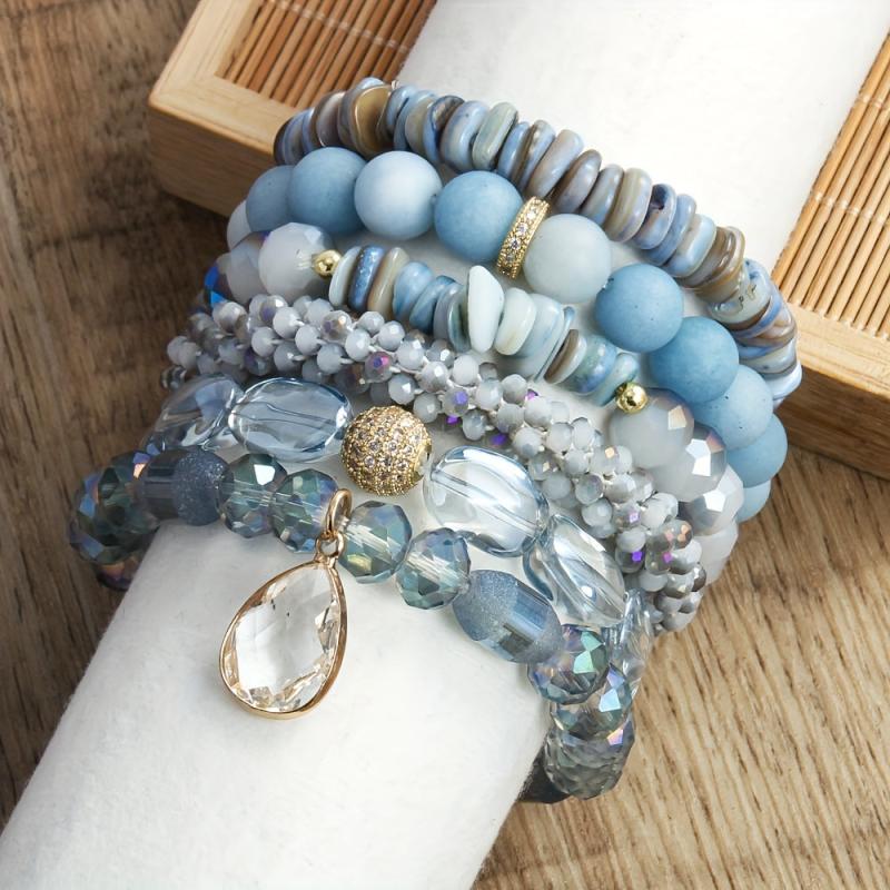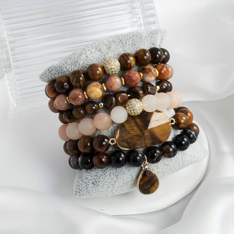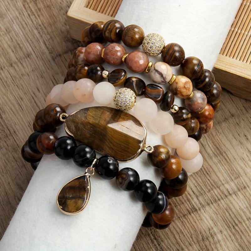 Elevate your style with this charming beaded bracelet set featuring natural stones, glass beads, and golden charms. Perfect for everyday wear and makes a great gift for any occasion.