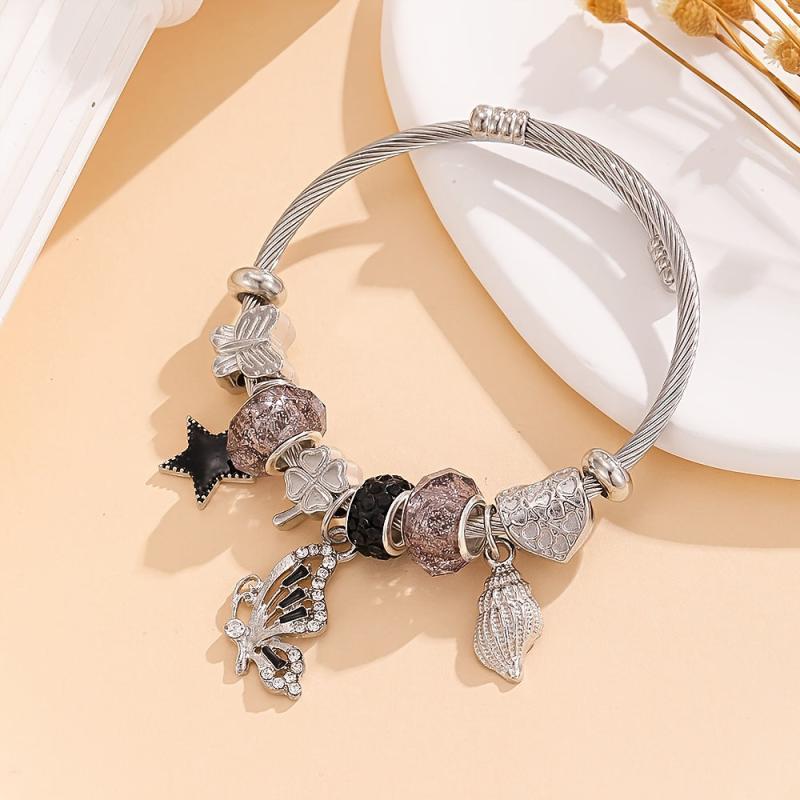 This stainless steel bracelet features silver plated DIY charm bracelet style with butterfly and star charms. The bracelet is adorned with rhinestone accents.