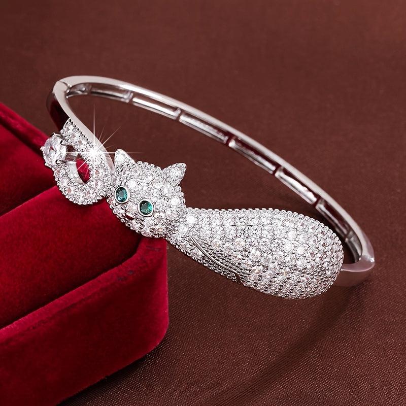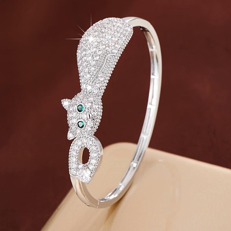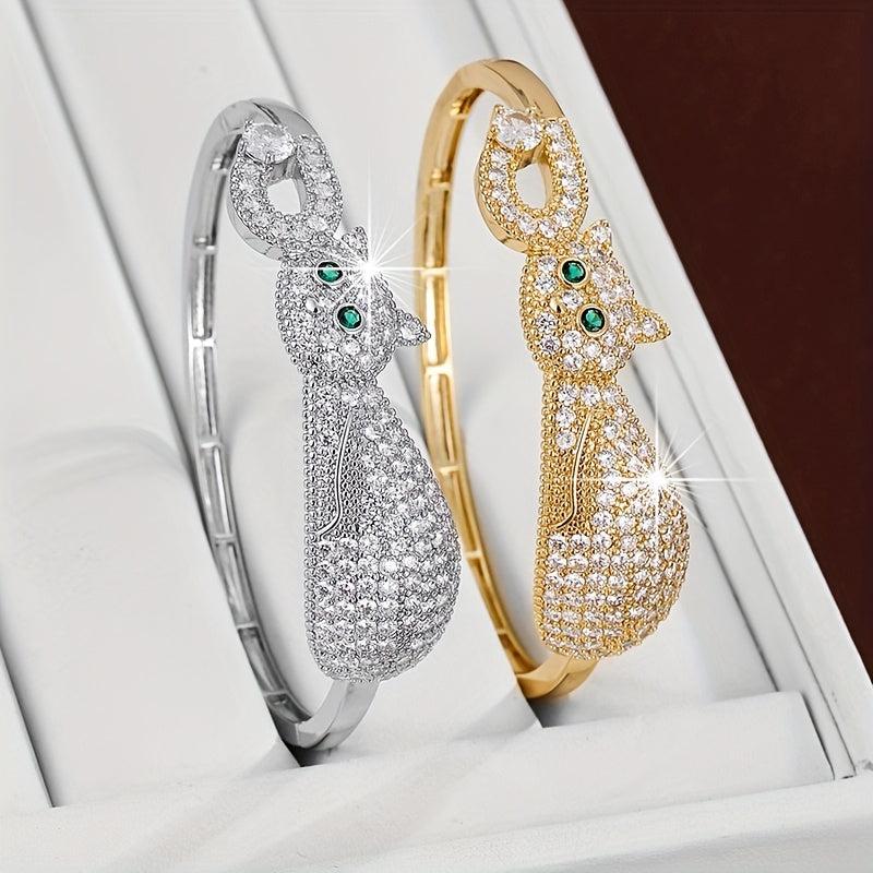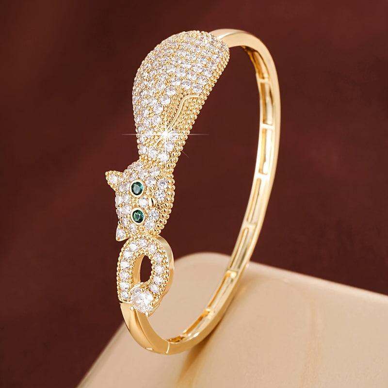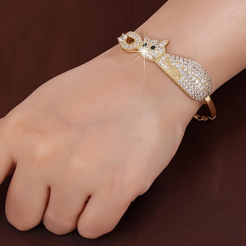 This elegant cat bracelet features sparkling zirconia crystals and durable golden tone plating. Perfect for everyday wear or special occasions.