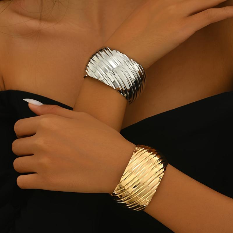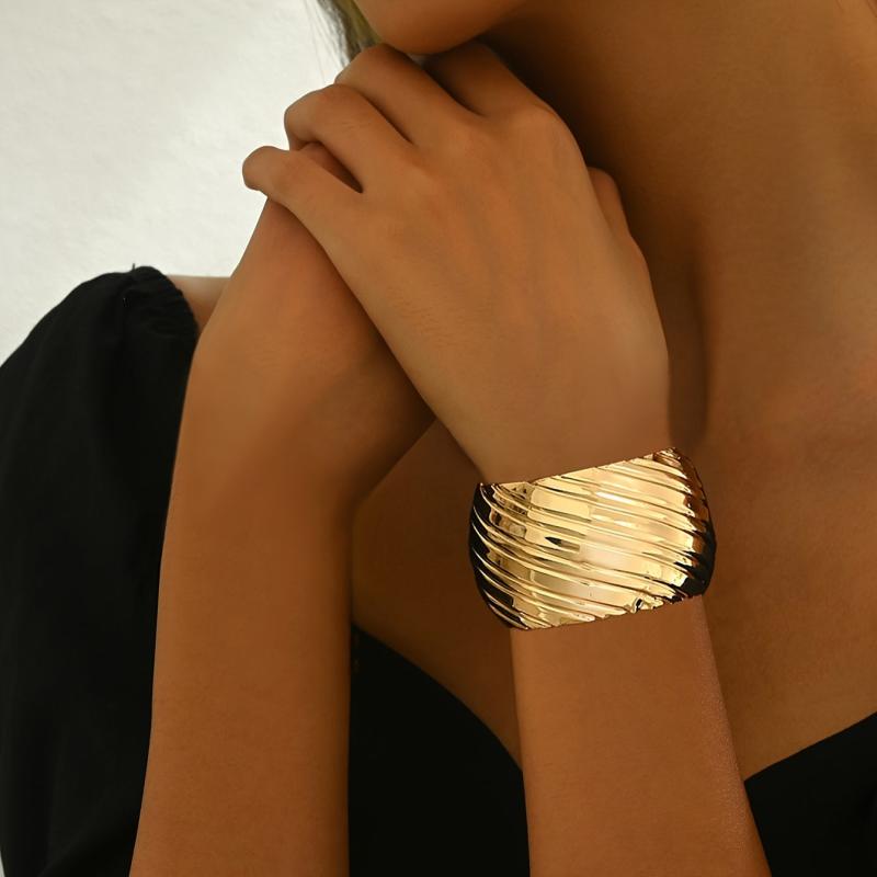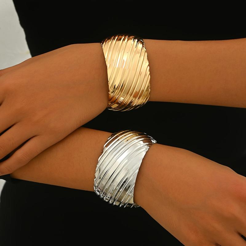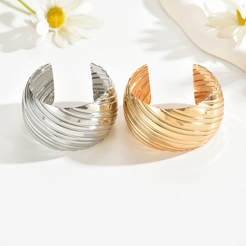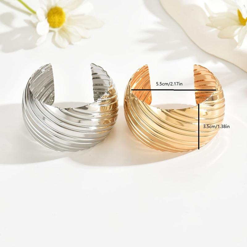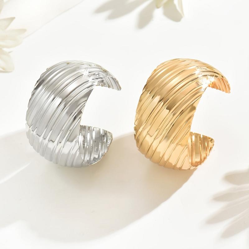 Elevate your look with this stylish open bracelet featuring diagonal stripes in a mix of golden and silvery tones. This versatile piece can be worn alone or stacked with other bracelets for a trendy layered look.