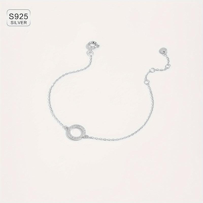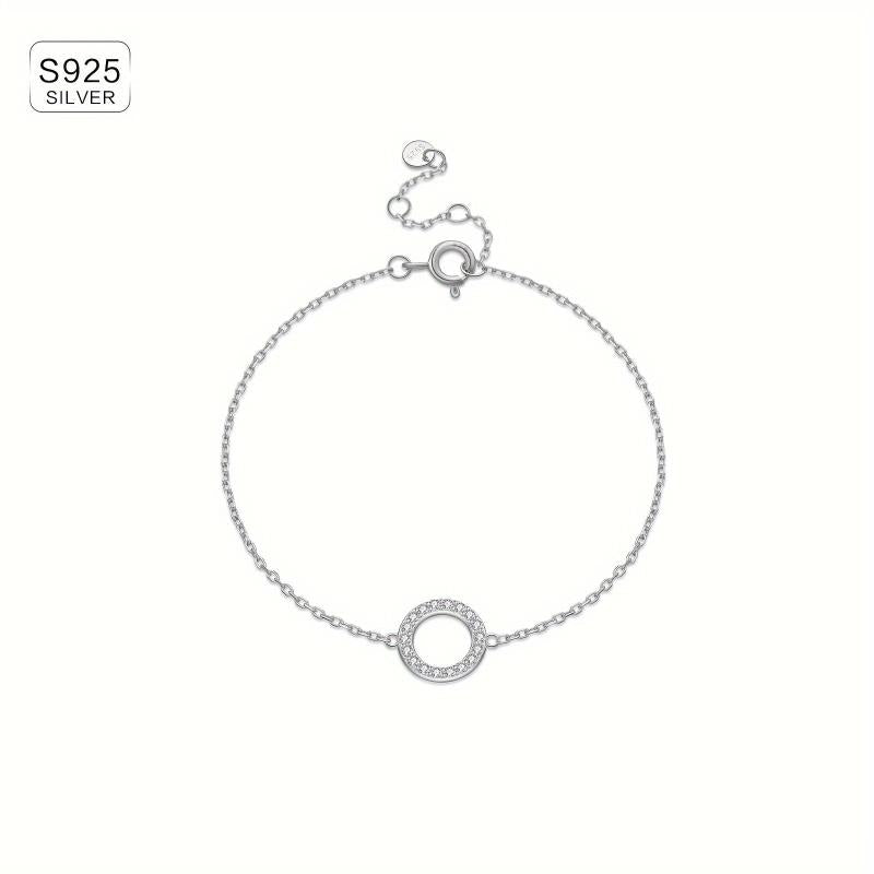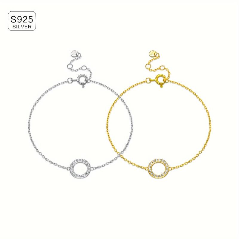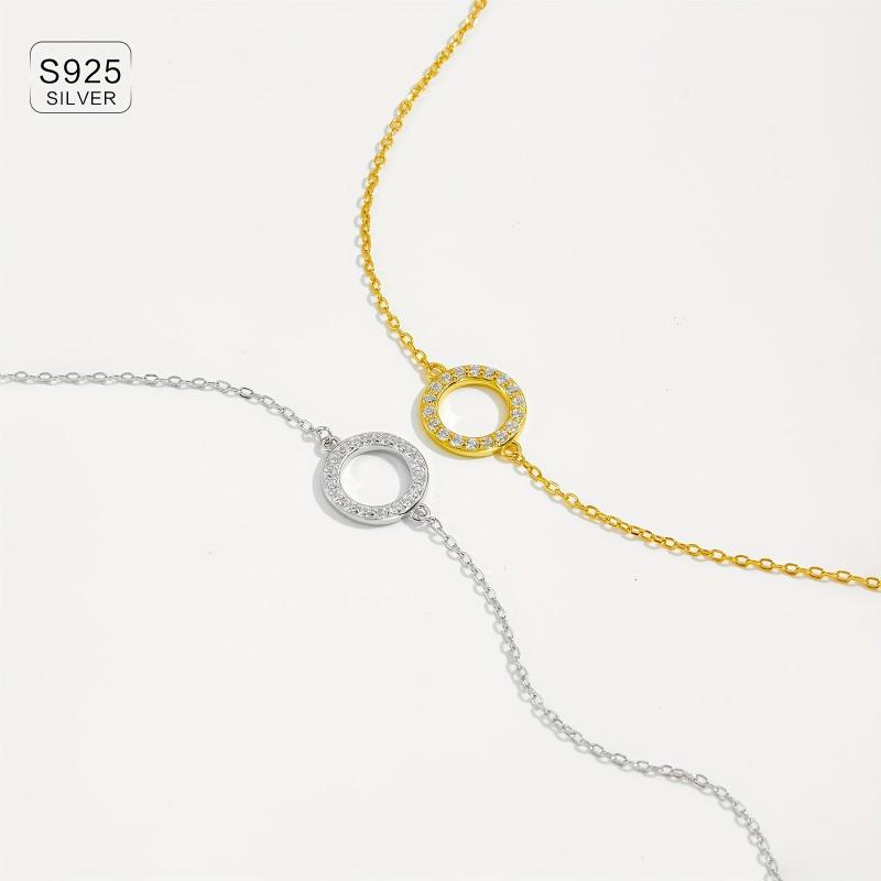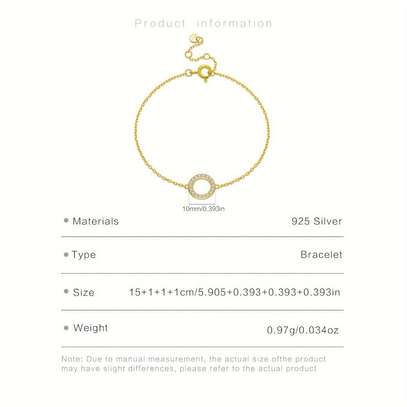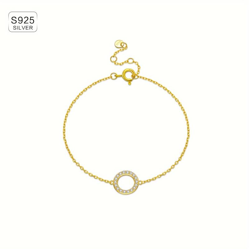 This stunning bracelet features a circle pendant in 925 sterling silver with synthetic zirconia stones. The chain is allergy-free and has an 18k golden plated finish. Versatile style that makes it a perfect gift for women.
