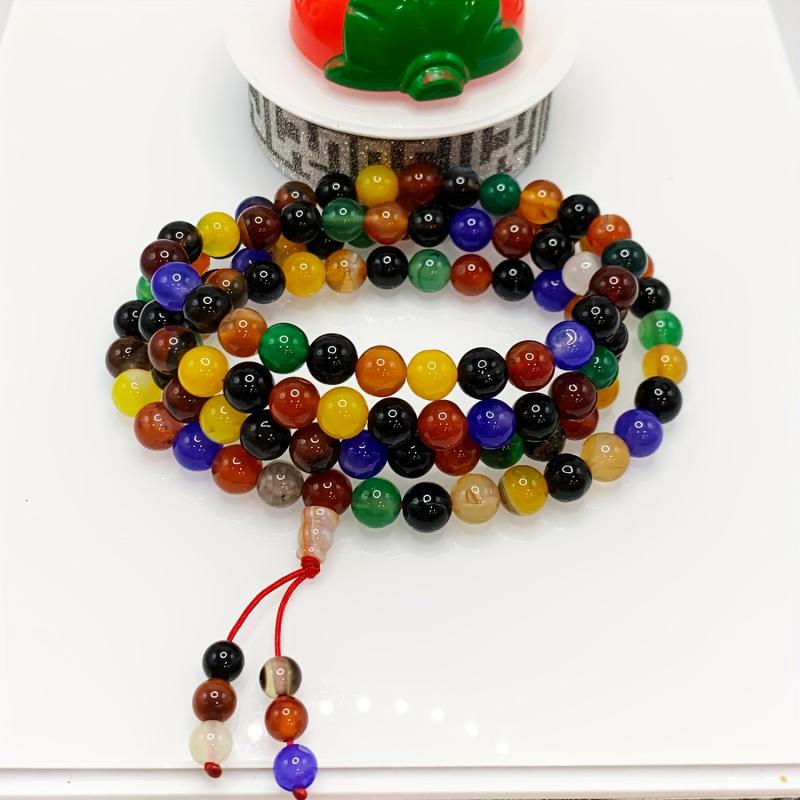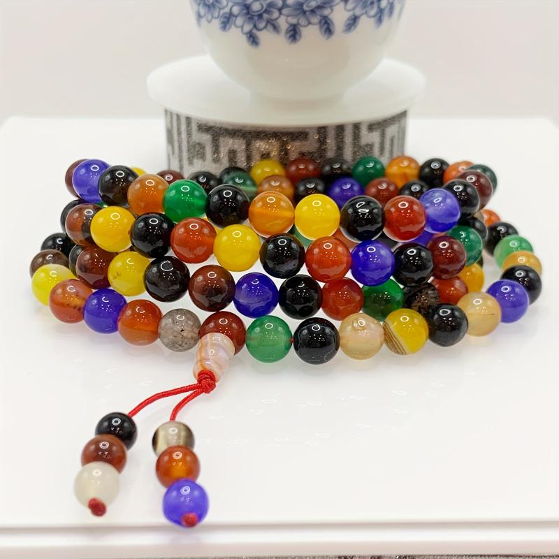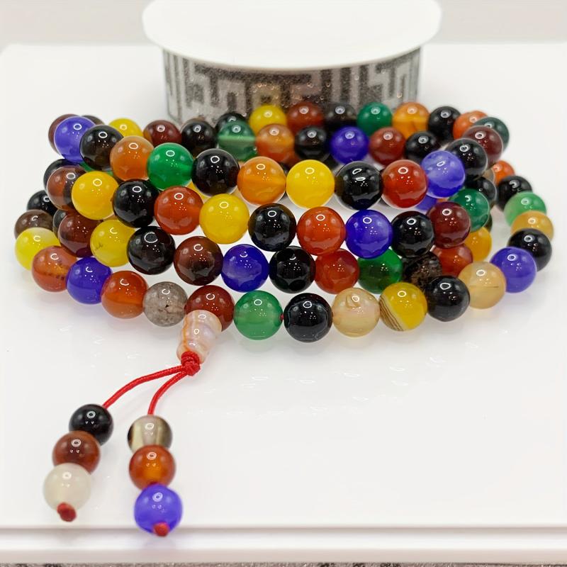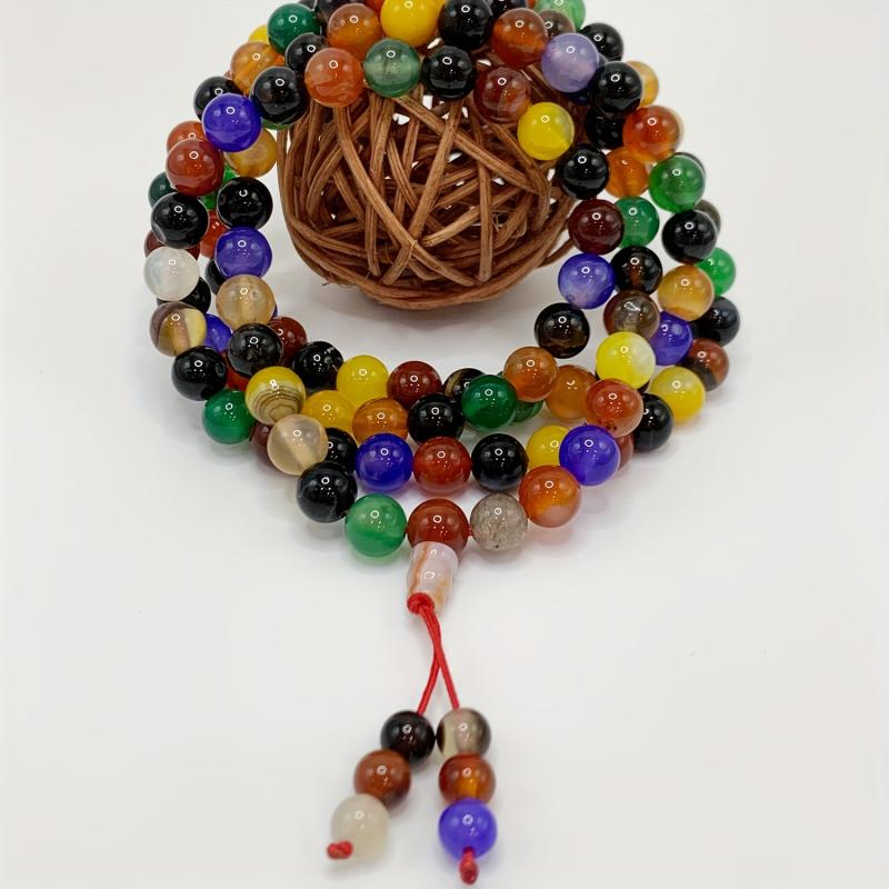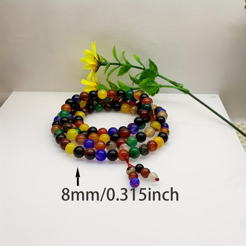 This 8mm bead bracelet features 108pcs of colorful agate beads, perfect for adding a touch of peace and protection to your look.