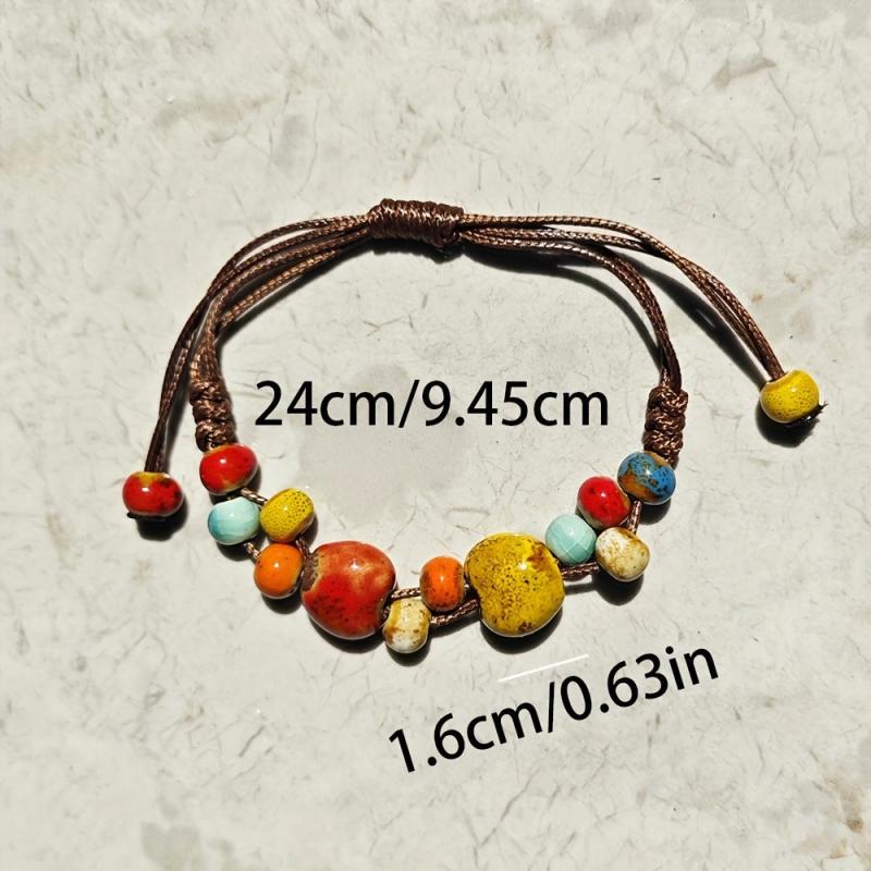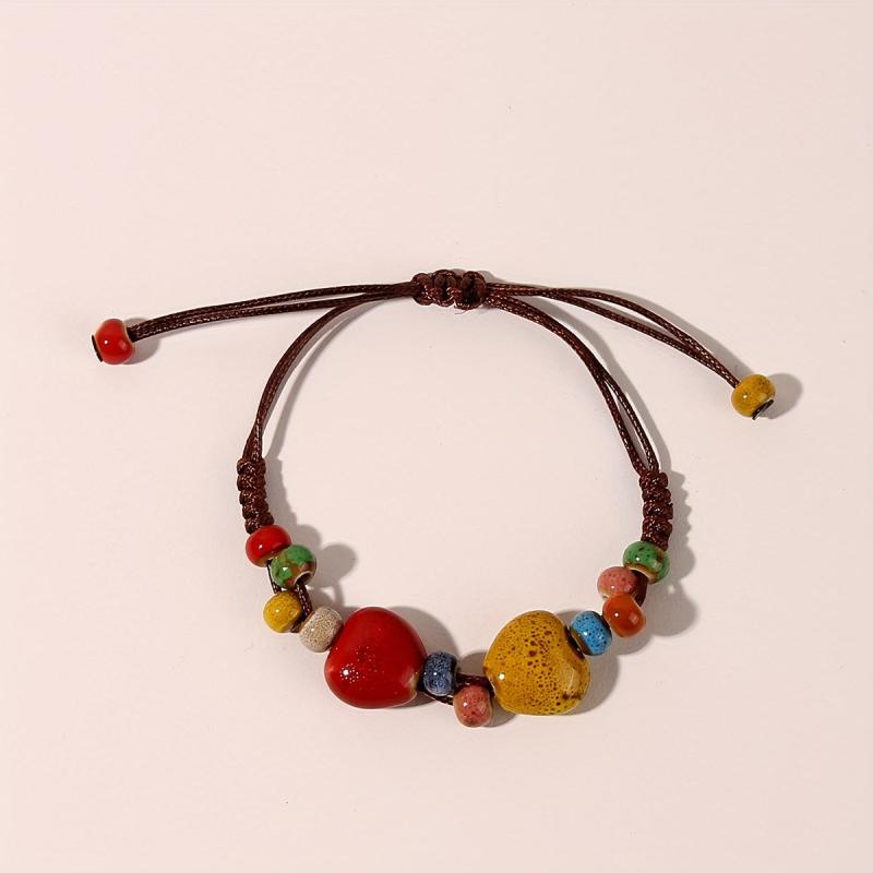Add a touch of traditional Chinese ethnic style to your look with this colorful love heart charm bracelet featuring ceramic beads. Perfect for adding a pop of color and personality to your outfit.