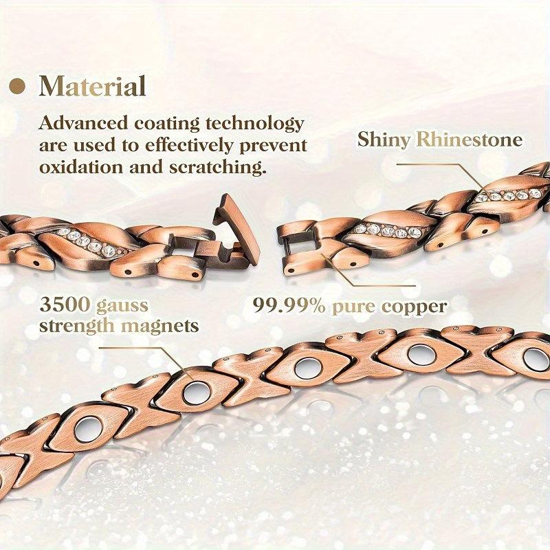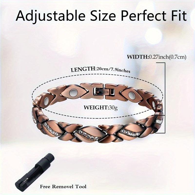 This copper bracelet features sparkling crystal accents and an adjustable size, making it perfect for daily wear. Its classic design fits all seasons.