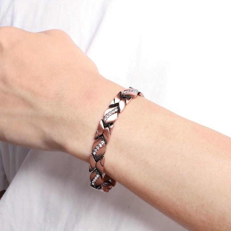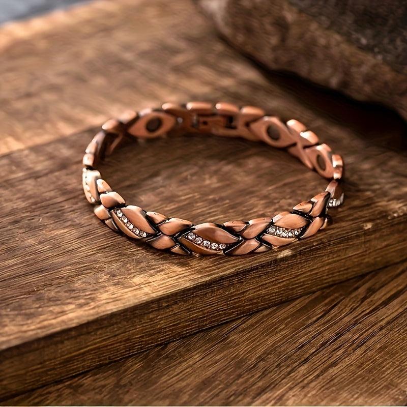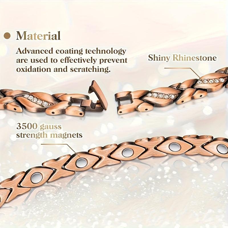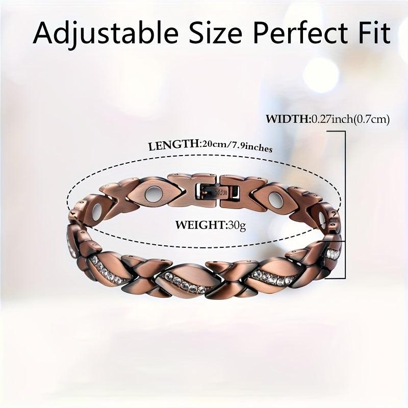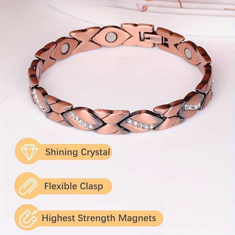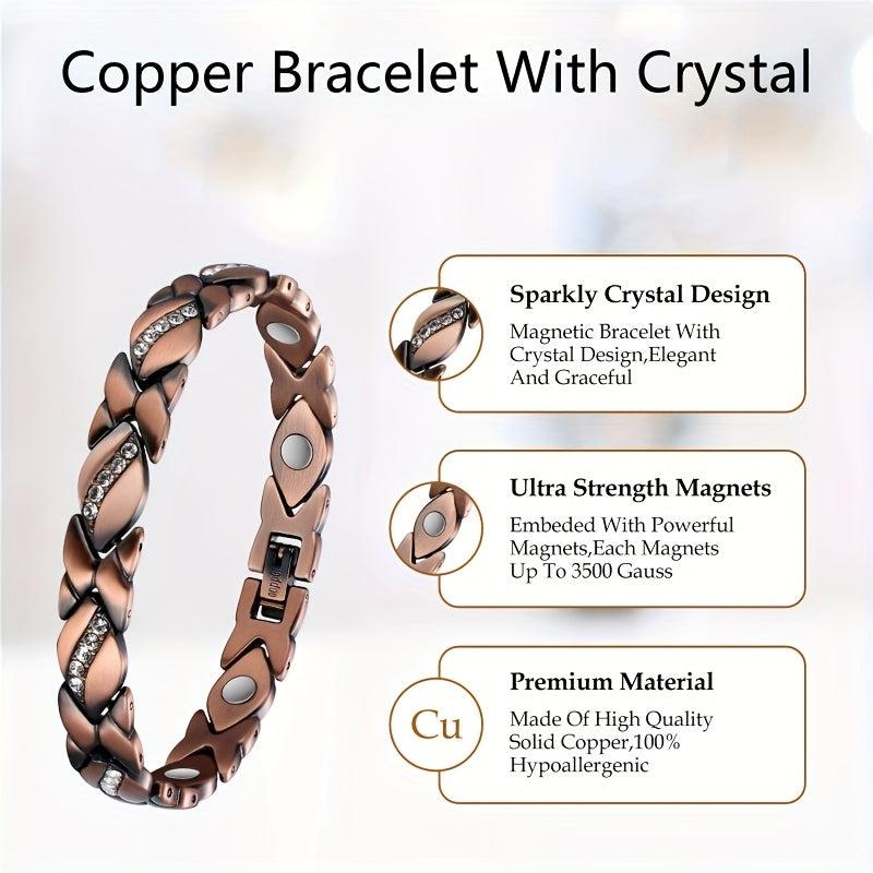 This adjustable copper magnetic bracelet is designed for women with a crystal embellishment. It has a 3500 Gauss strength, is hypoallergenic, and makes an ideal Mother's Christmas gift.