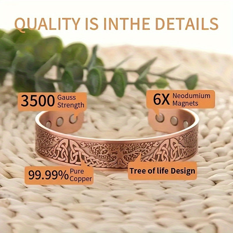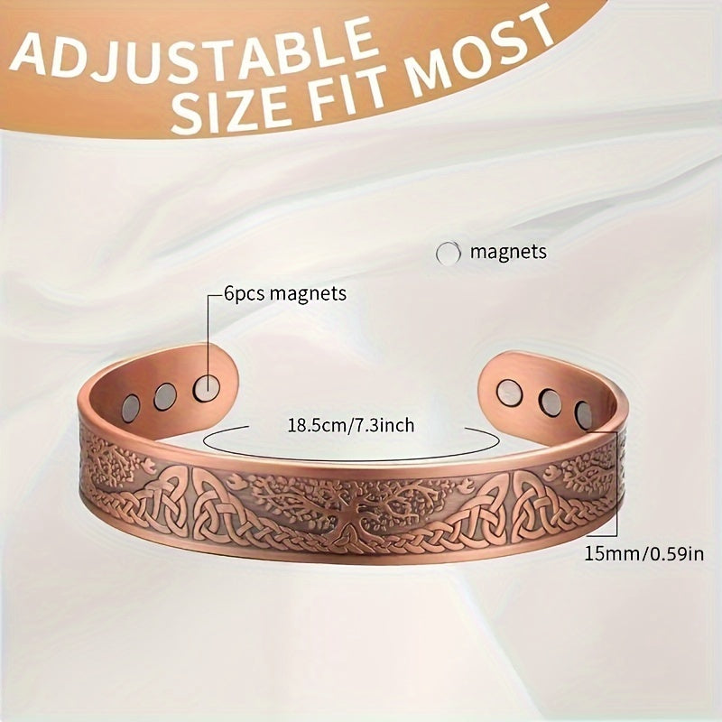 Upgrade your style with this adjustable cuff bangle featuring a Tree of Life design. Includes 6 ultra strong magnets for added benefits. Perfect gift for birthdays and holidays.
