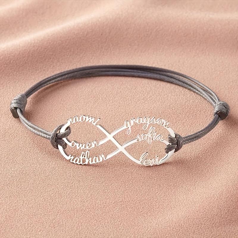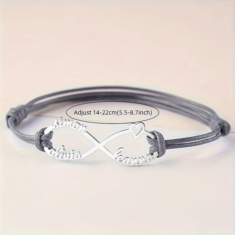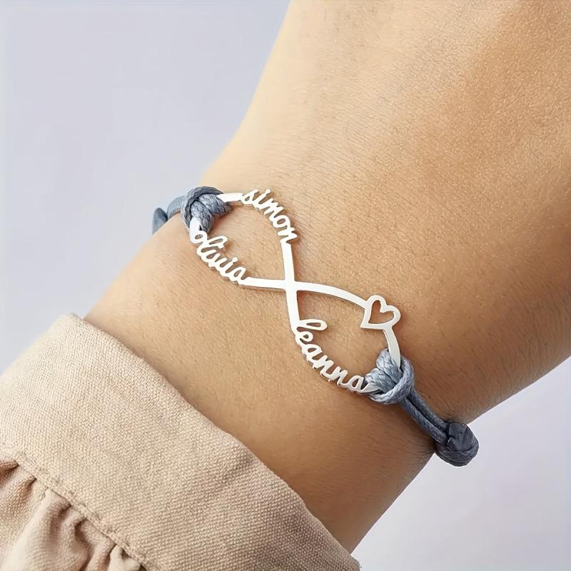 This adjustable bracelet features a beautiful infinity heart design, personalized with up to 6 names. Made from high-quality 18K gold plated stainless steel, this piece is ideal for daily wear or as a meaningful gift.