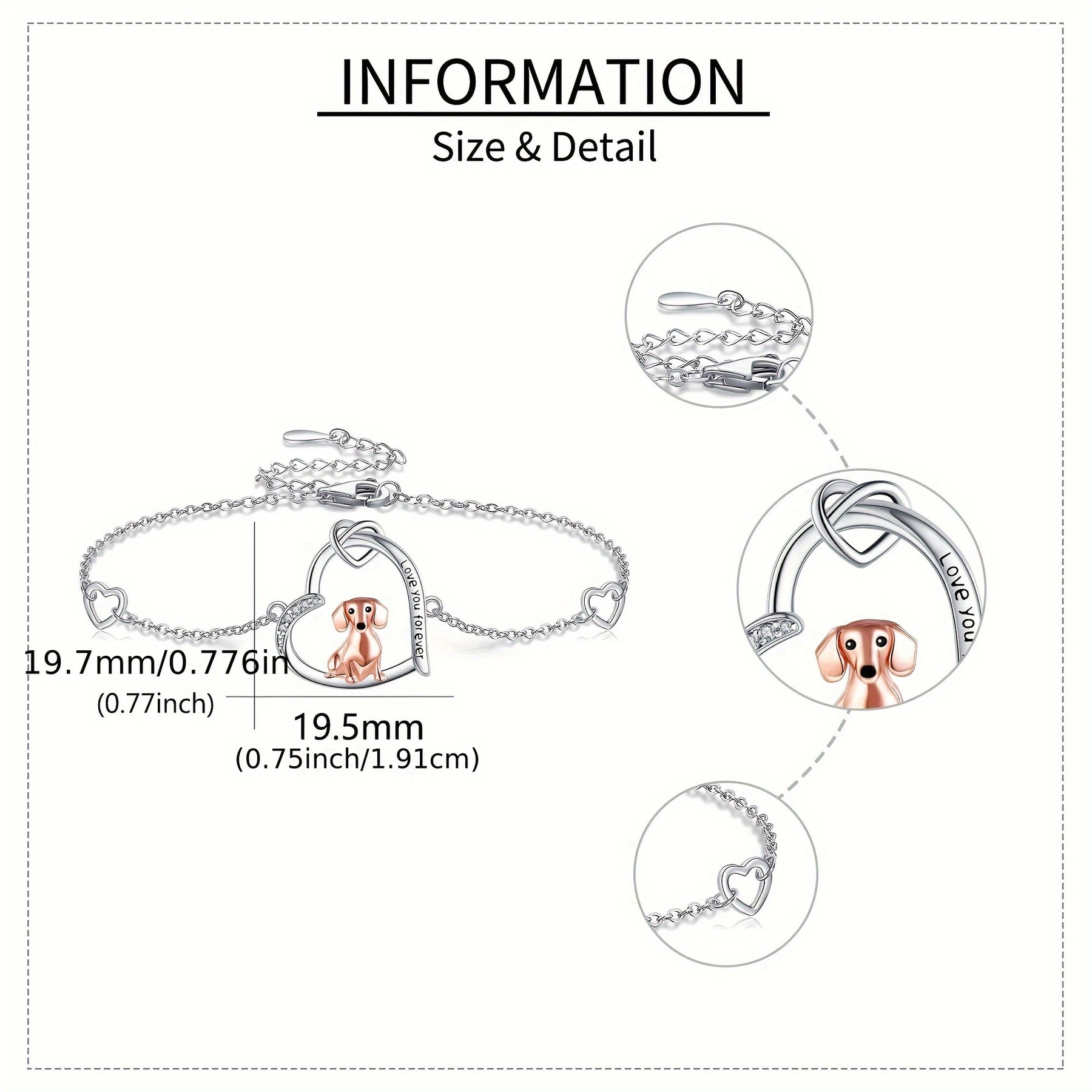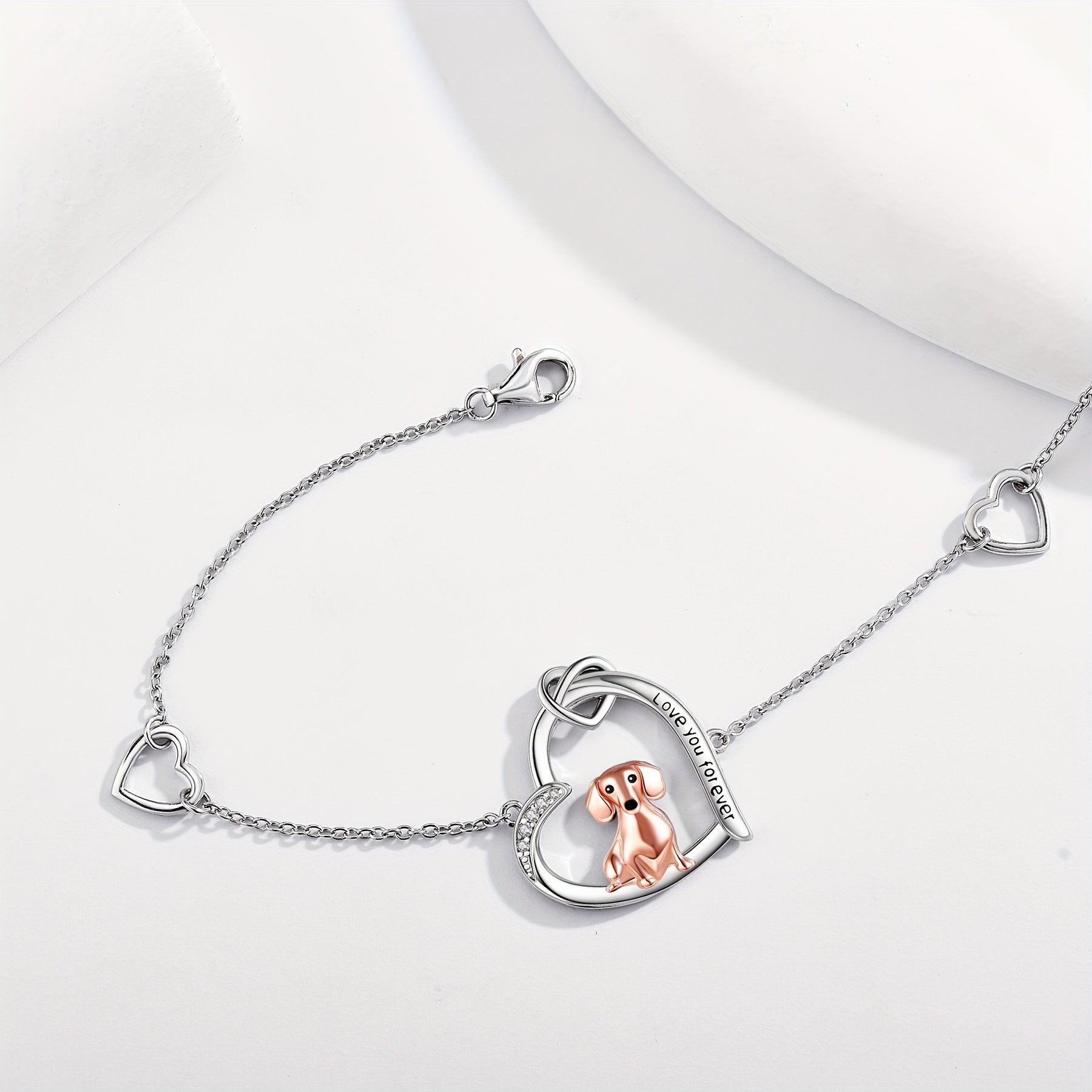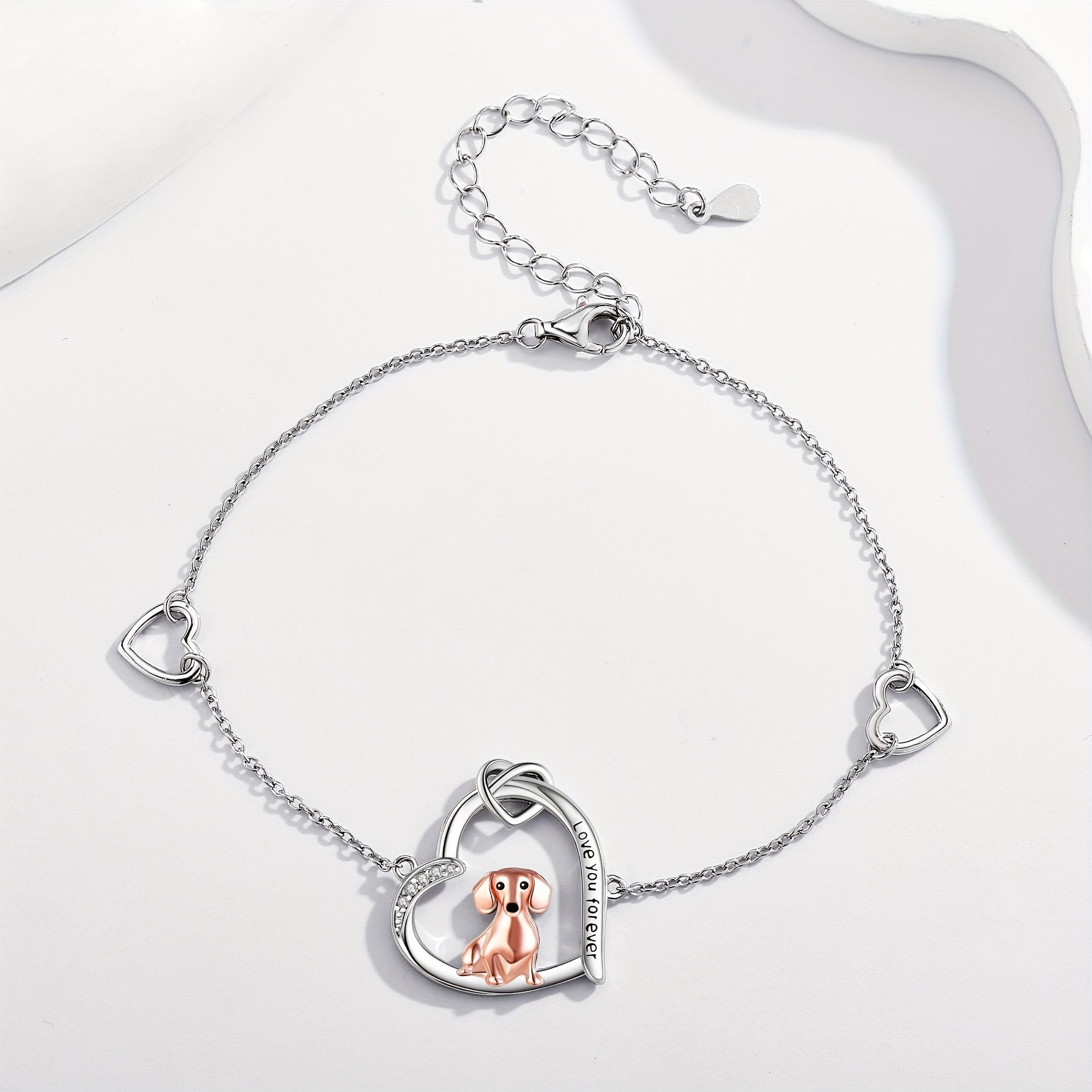 This elegant dachshund bracelet is made of high-quality 925 sterling silver, featuring a heart charm. It is a perfect gift for dachshund lovers and women.