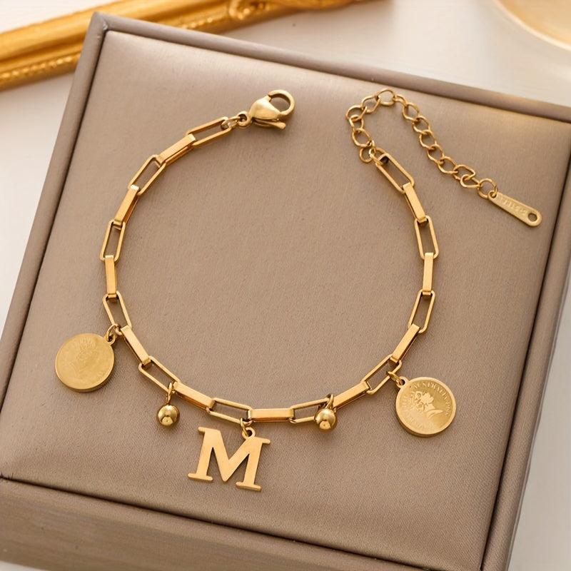Make a bold statement with this edgy hip hop stainless steel bracelet. It features an adjustable chain link design with circular charms and an initial 'S' pendant. A perfect gift for someone who loves unique jewelry.