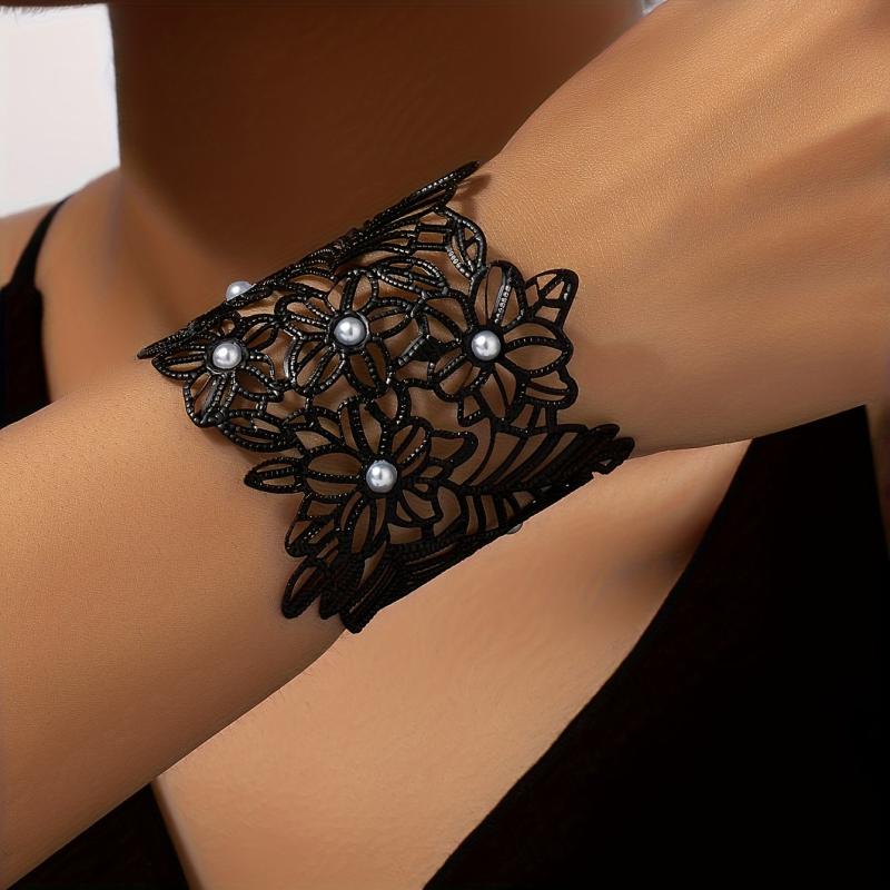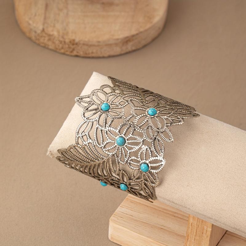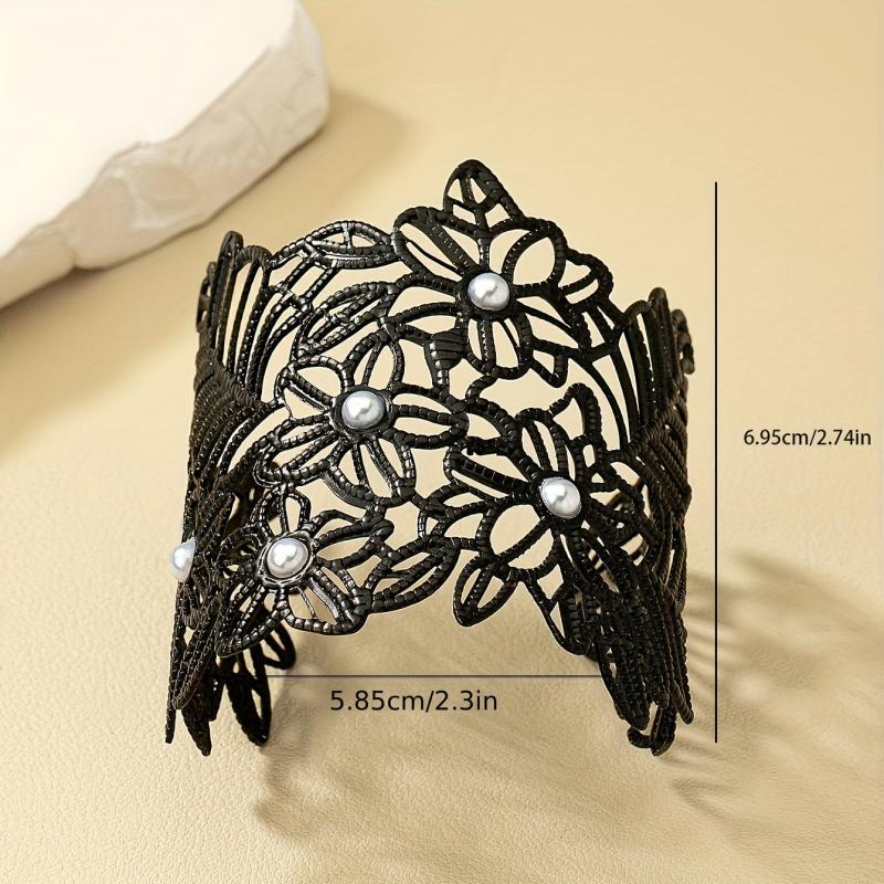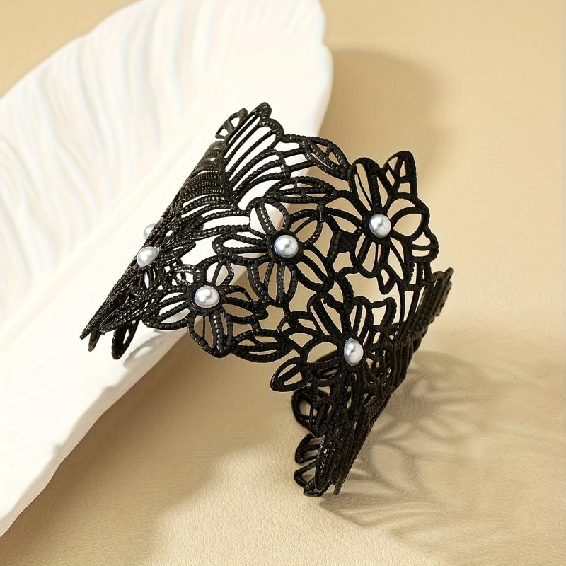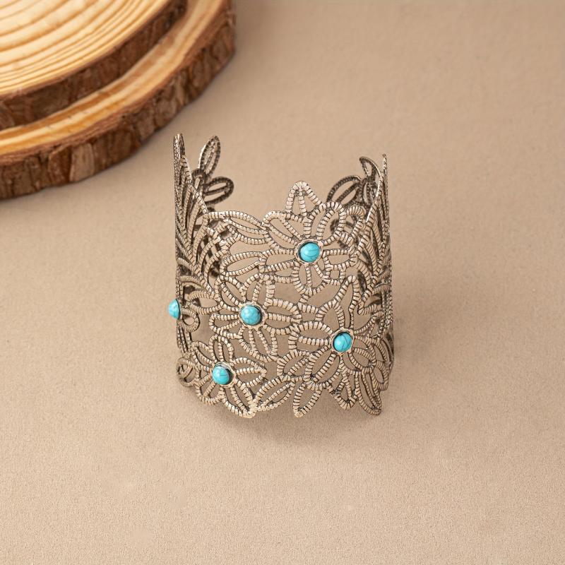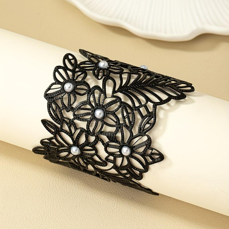 Elegant vintage French lace design on an openwork alloy cuff bracelet. Versatile for everyday wear or special occasions. A timeless accessory that can elevate any outfit.