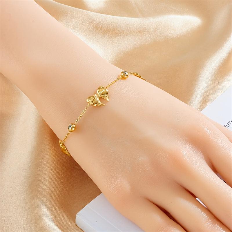 Add a touch of elegance with this stainless steel bracelet featuring a golden bow and rhinestones. Suitable for daily wear or special occasions, this bracelet is a versatile accessory.
