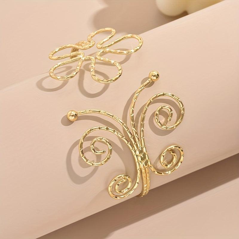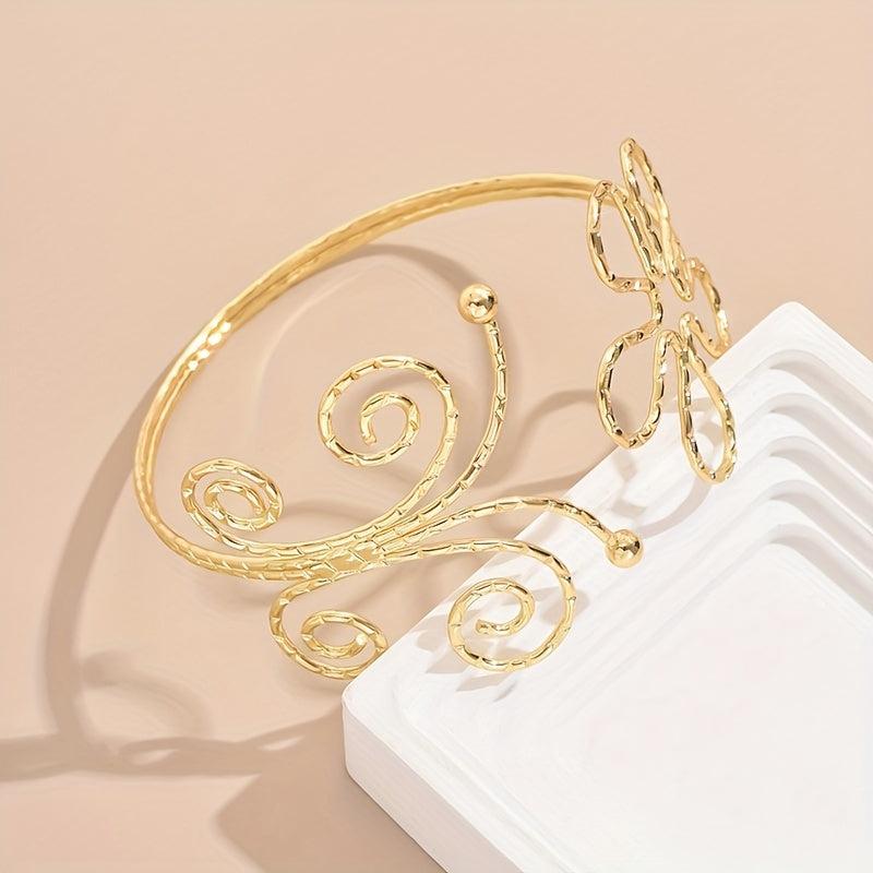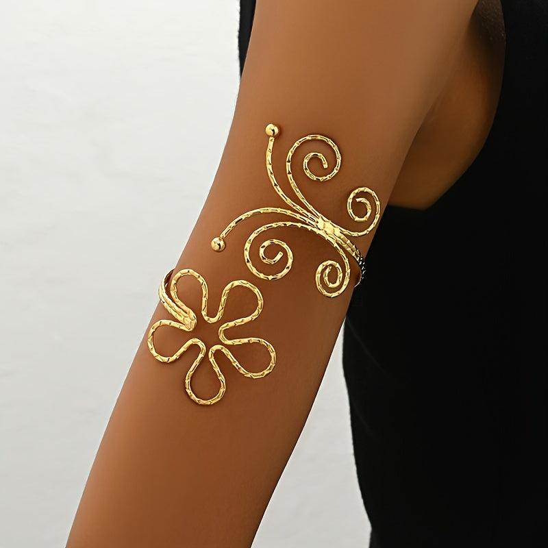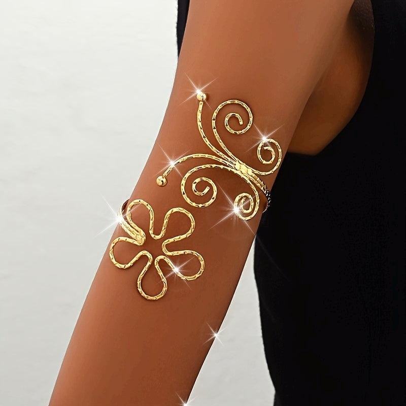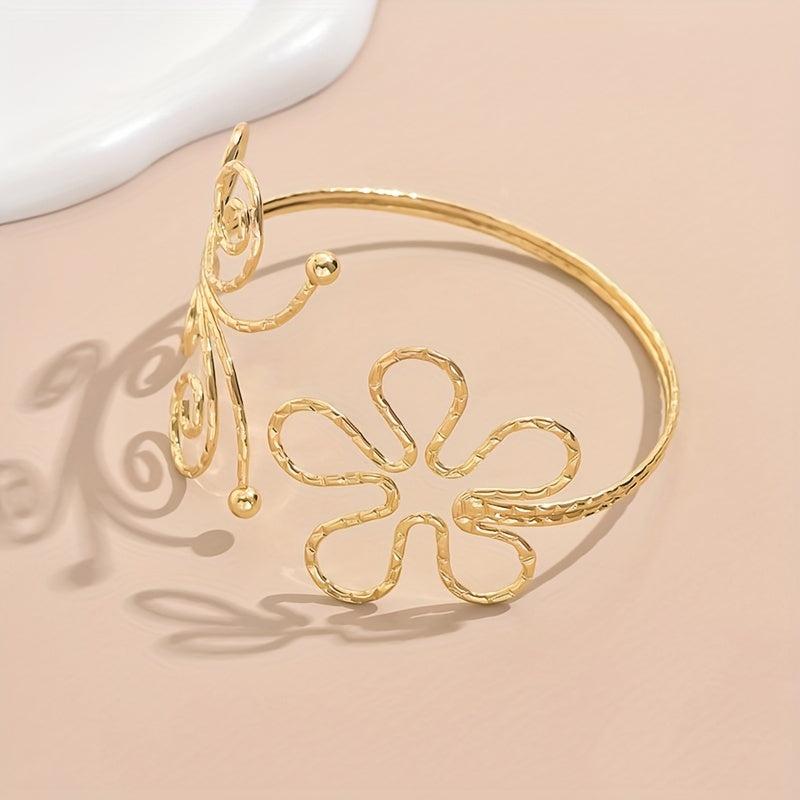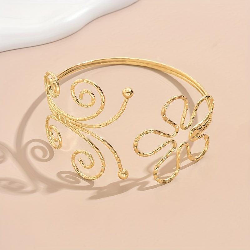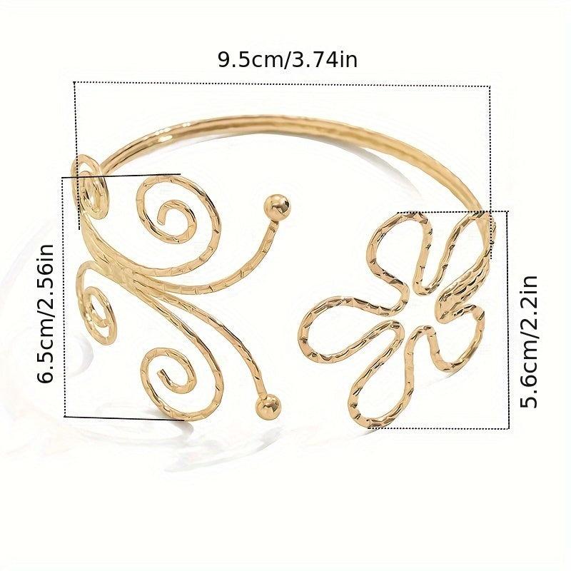 This bracelet features an exaggerated geometric hollow design with a stunning flower and butterfly motif. Perfect for women who love bold and unique jewelry.