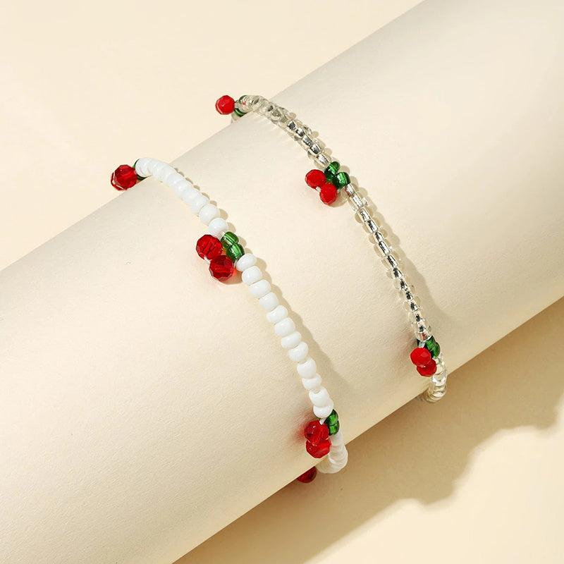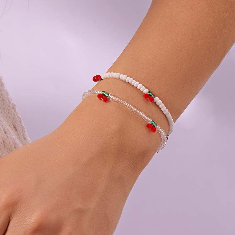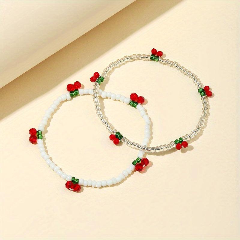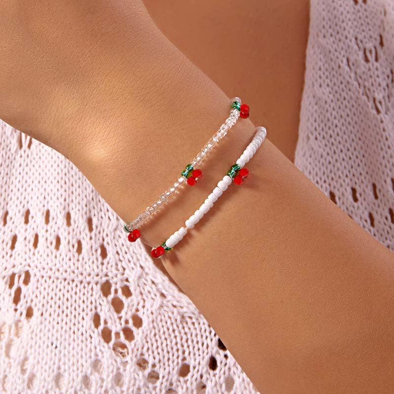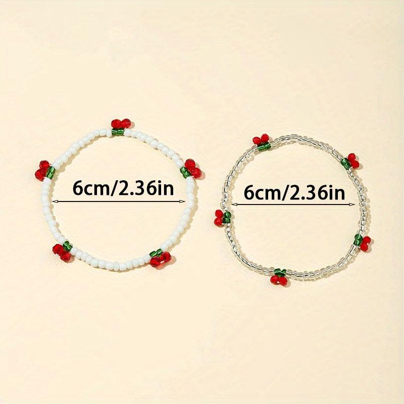 This 2pcs bracelet set is ideal for summer vacation or everyday wear. The cherry and red gems on clear elastic bands add a touch of color and style to your outfit.