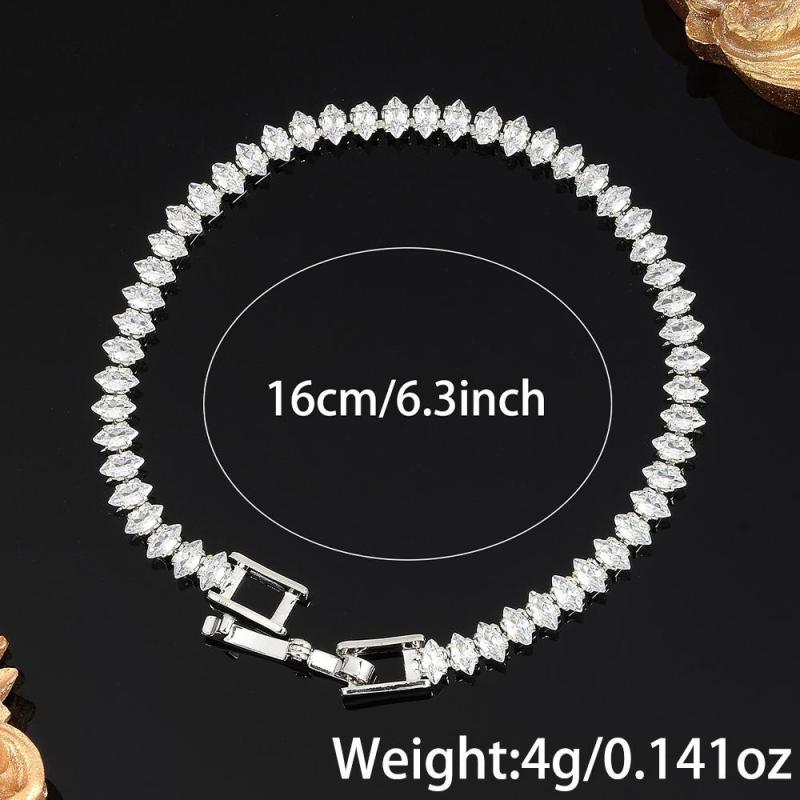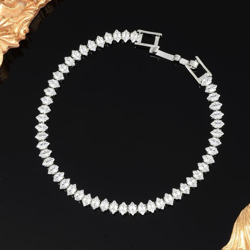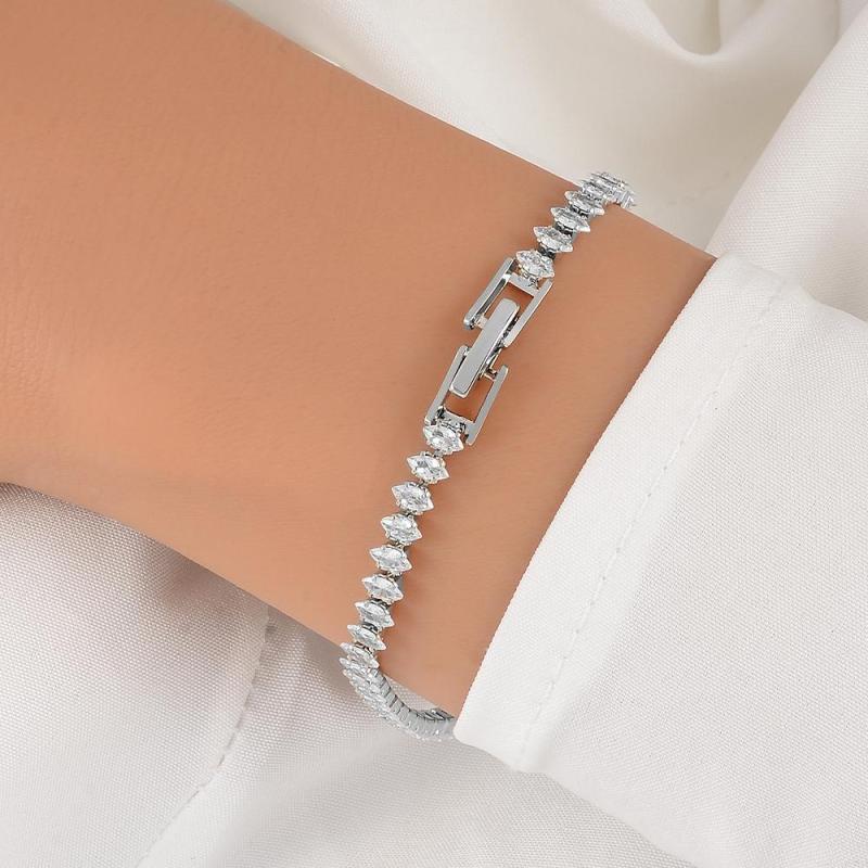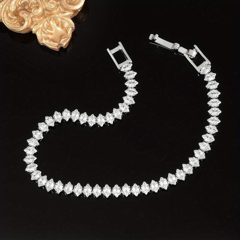 A stylish tennis bracelet featuring marquise cut synthetic zirconia stones. Perfect for daily wear, this golden plated copper accessory is suitable for all seasons.