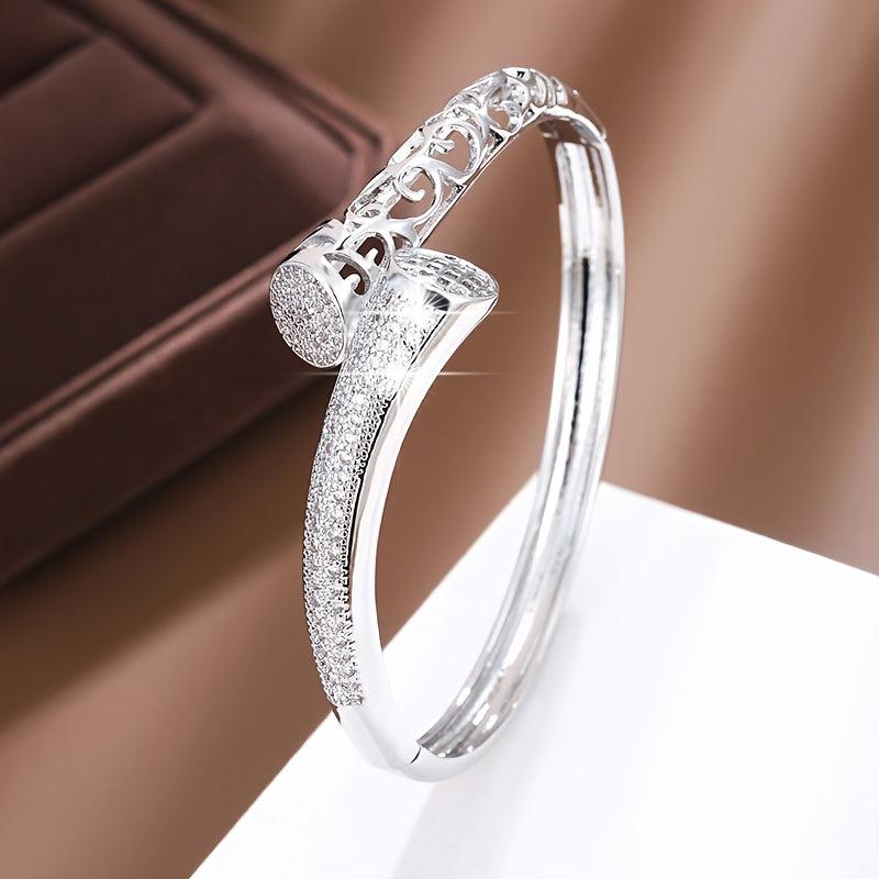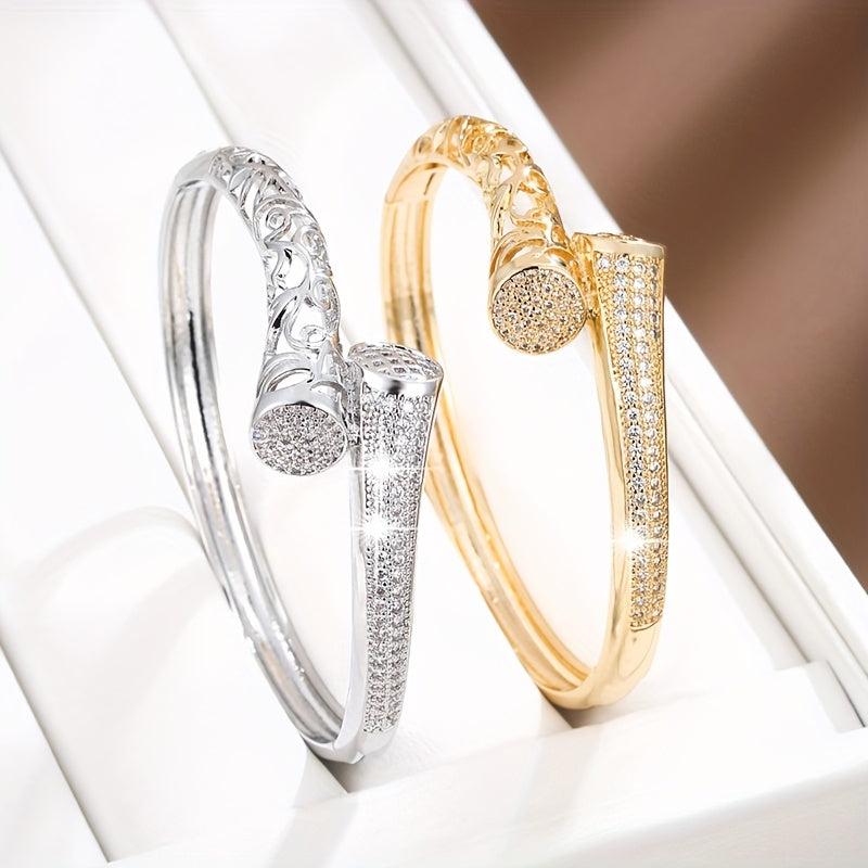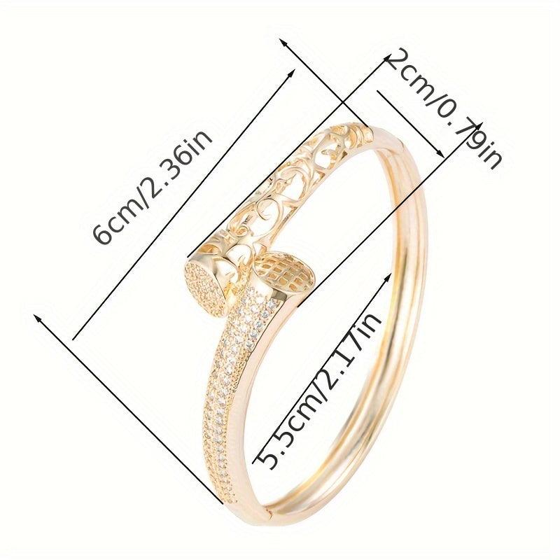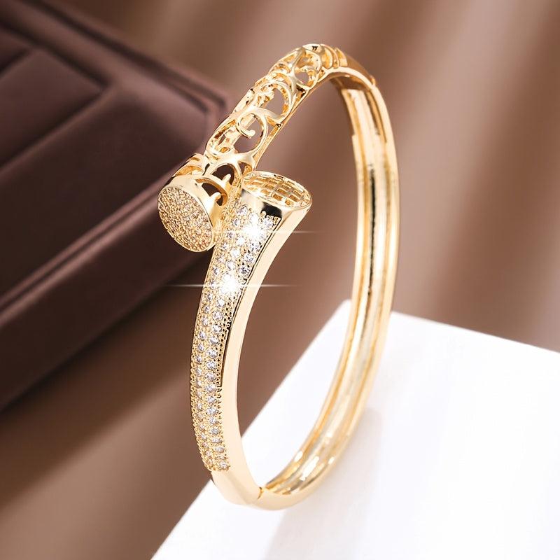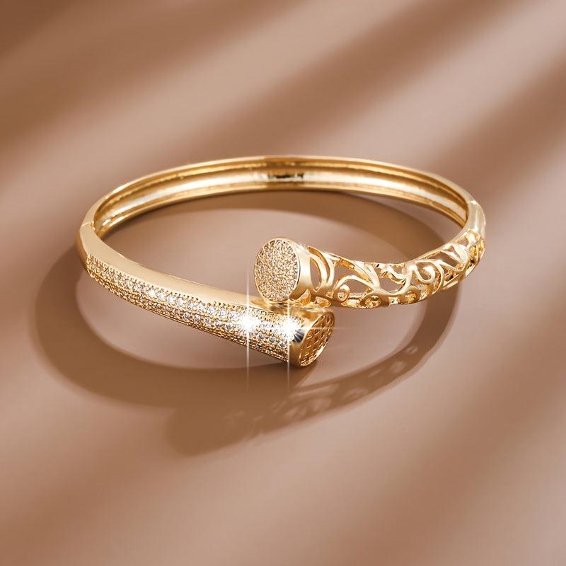 Elevate your style with this exquisite Golden Plated Synthetic Zirconia Bracelet featuring intricate hollow design adorned with sparkling stones. Perfect for daily wear or as a thoughtful gift for a loved one.