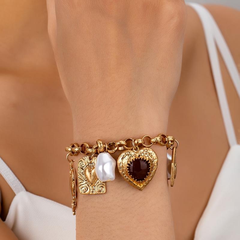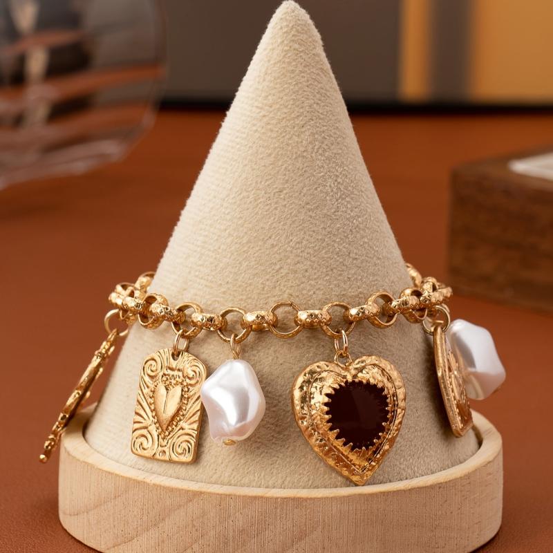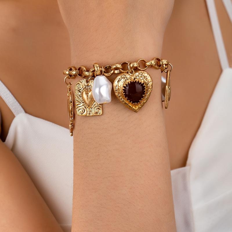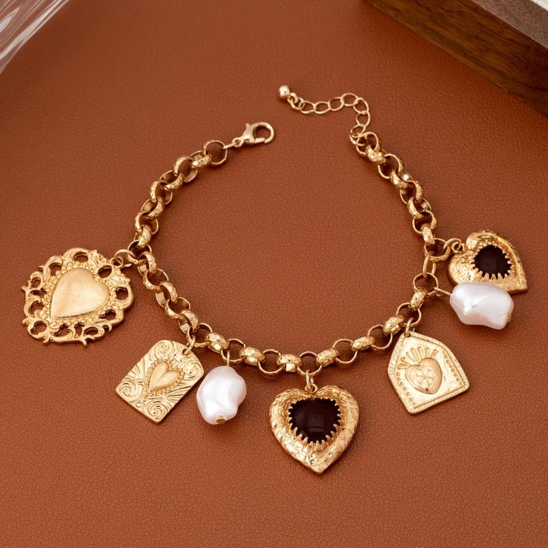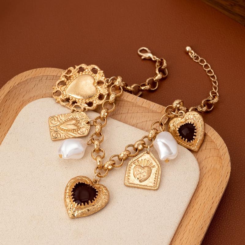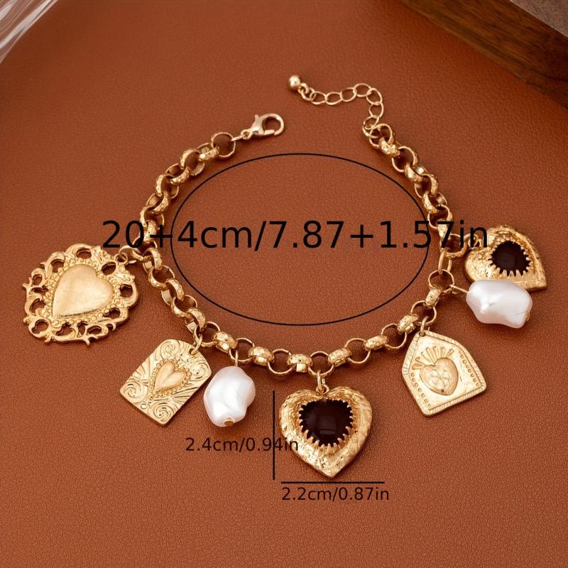 Add a touch of elegance to your outfit with this versatile charm bracelet. The golden tone zinc alloy bracelet features heart pearl and LOVE pendants, making it perfect for daily wear or parties.