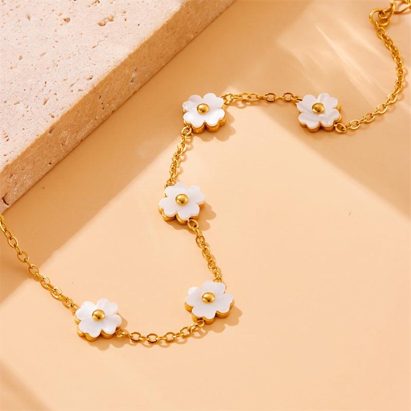 This bracelet features a golden tone stainless steel design adorned with delicate floral charms. It is ideal for daily wear or as a thoughtful gift for someone special.