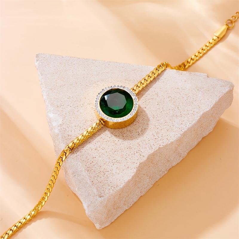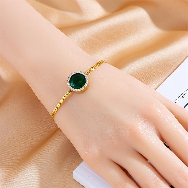 Golden Tone Stainless Steel Bracelet with Green Glass Stone