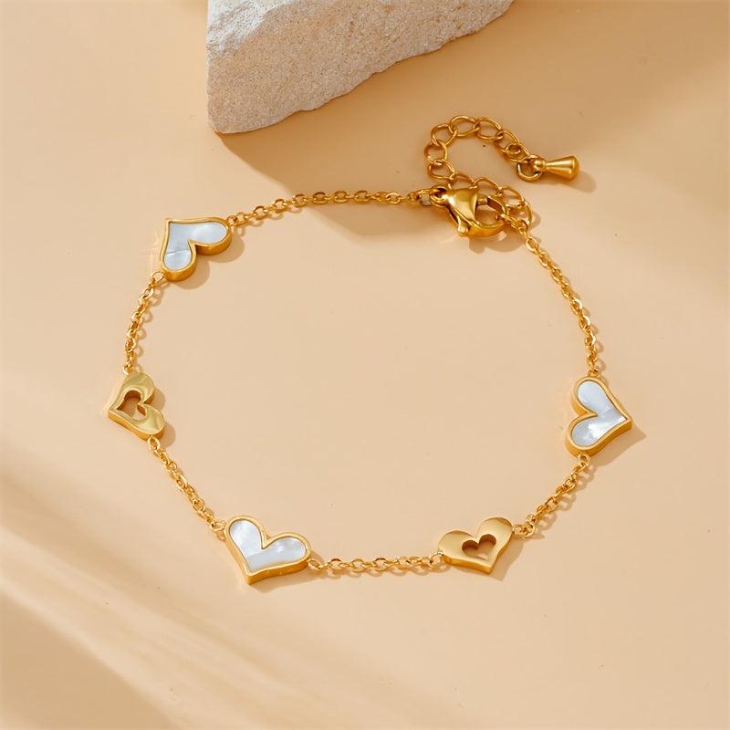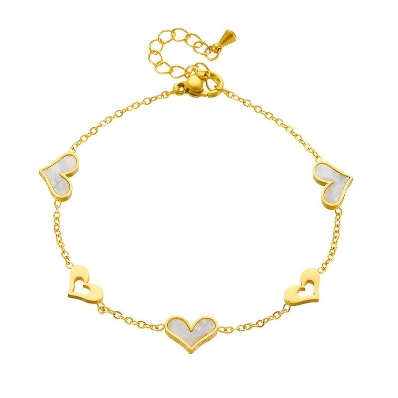 Elevate your casual attire or special occasions with this women's golden tone stainless steel bracelet featuring heart charms. Perfect for vacations and adding a bohemian touch to your outfits.