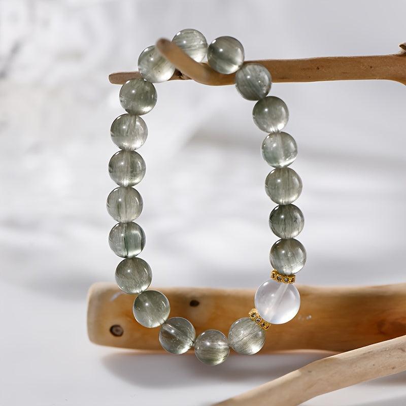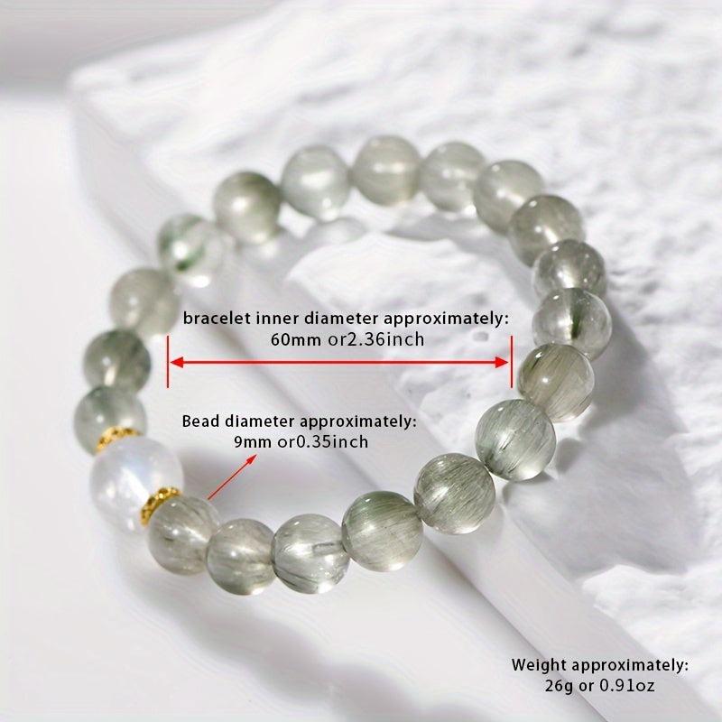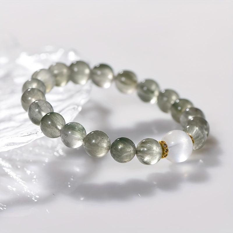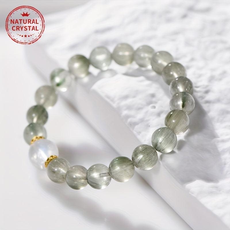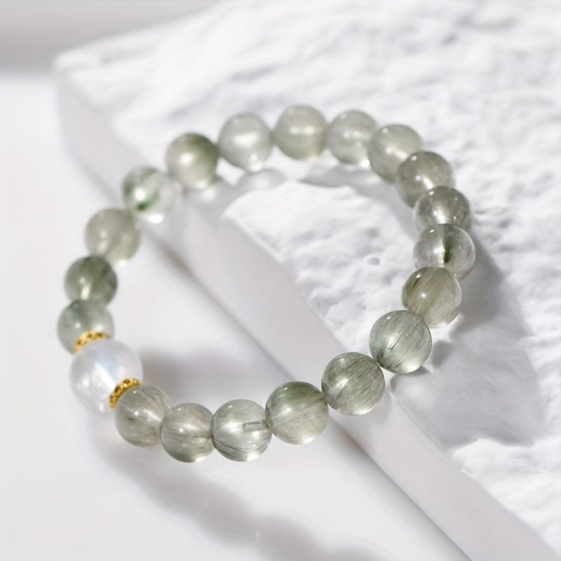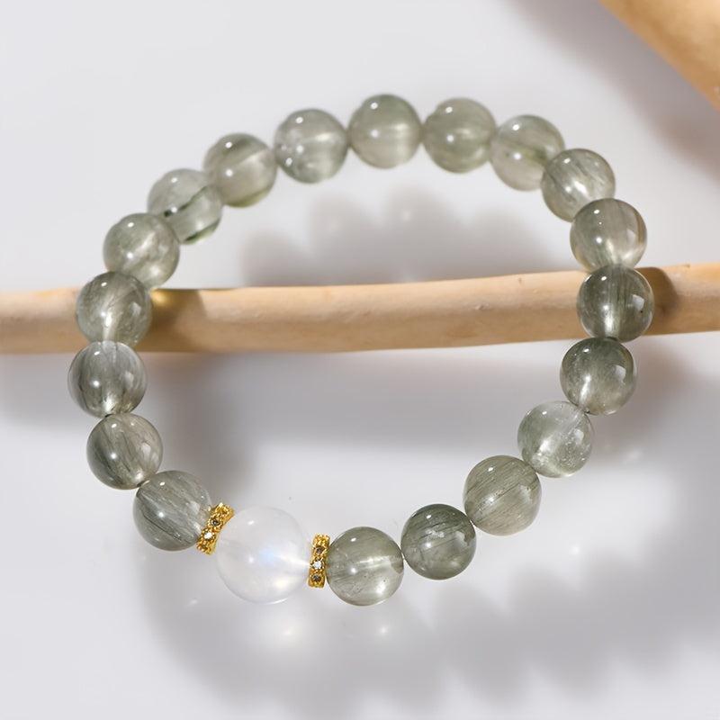 Beautiful bracelet featuring natural green crystal, moonstone, and crystal beads. Perfect gift for girlfriend's birthday.