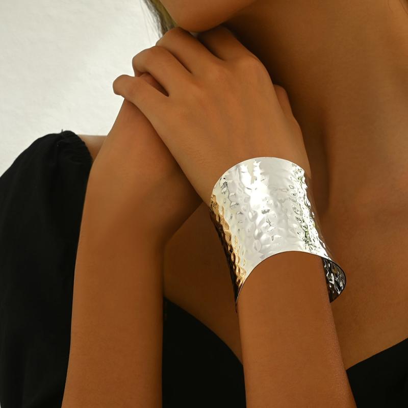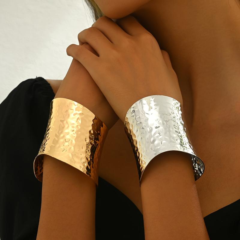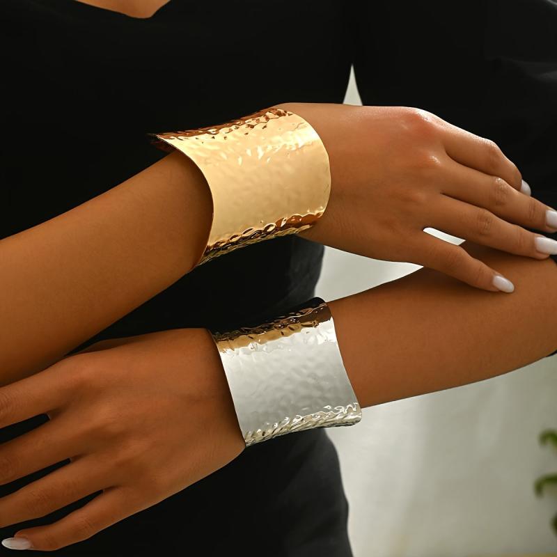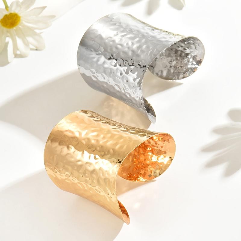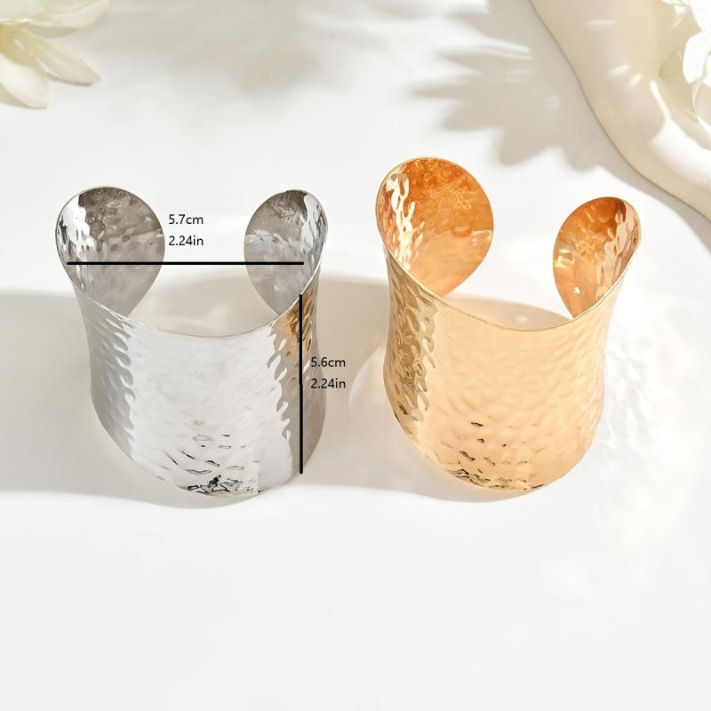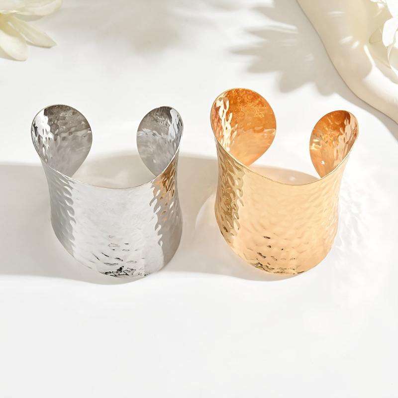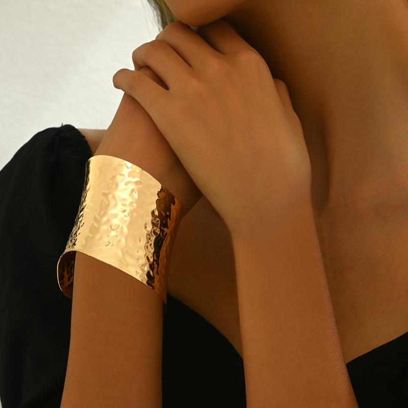Elegant open-ended bracelet with a hammered golden surface, perfect for adding a touch of style to any outfit. Can be worn alone or paired with other accessories.