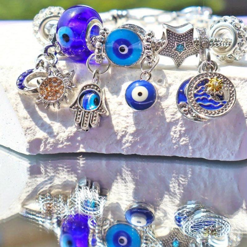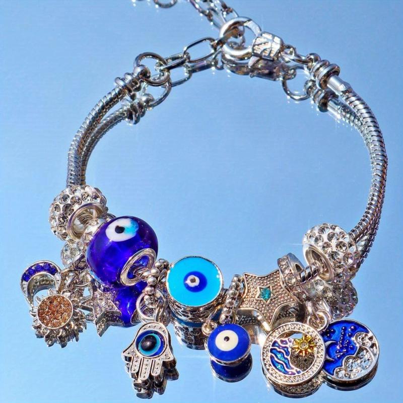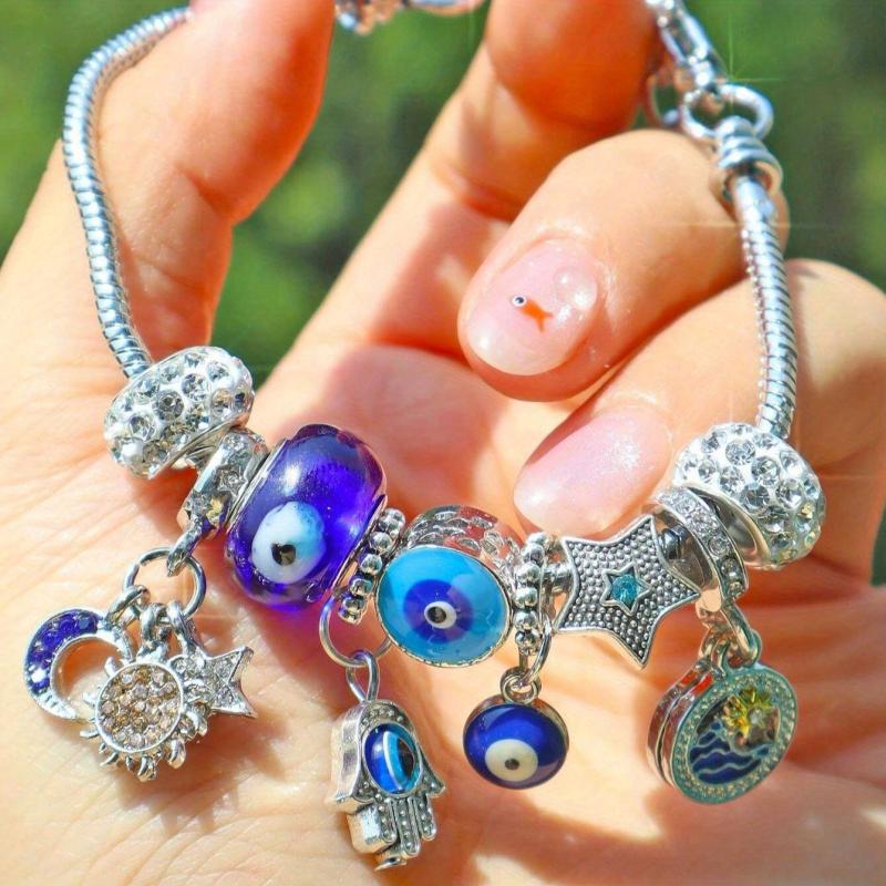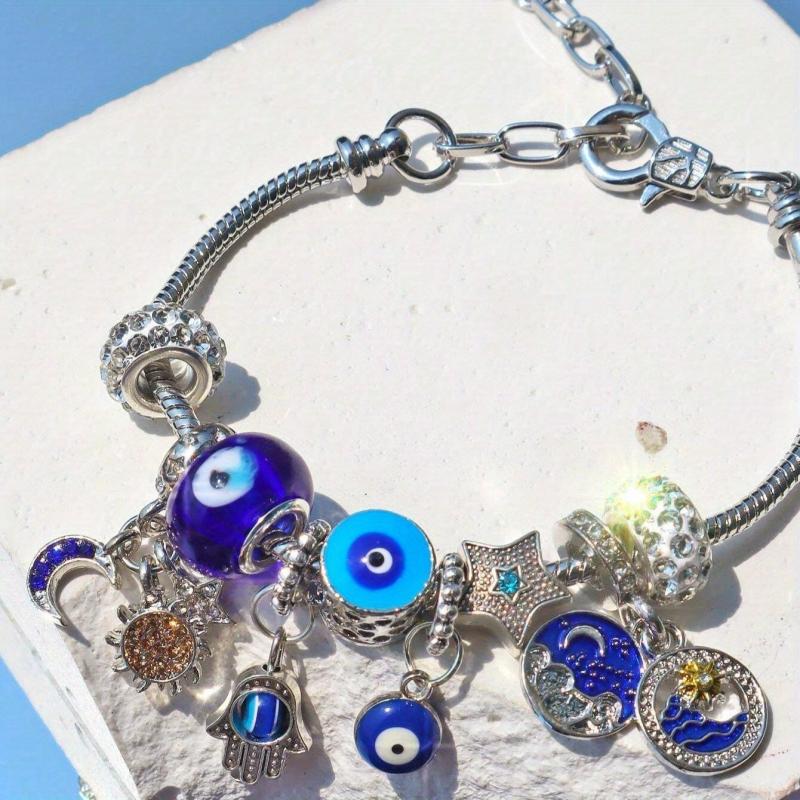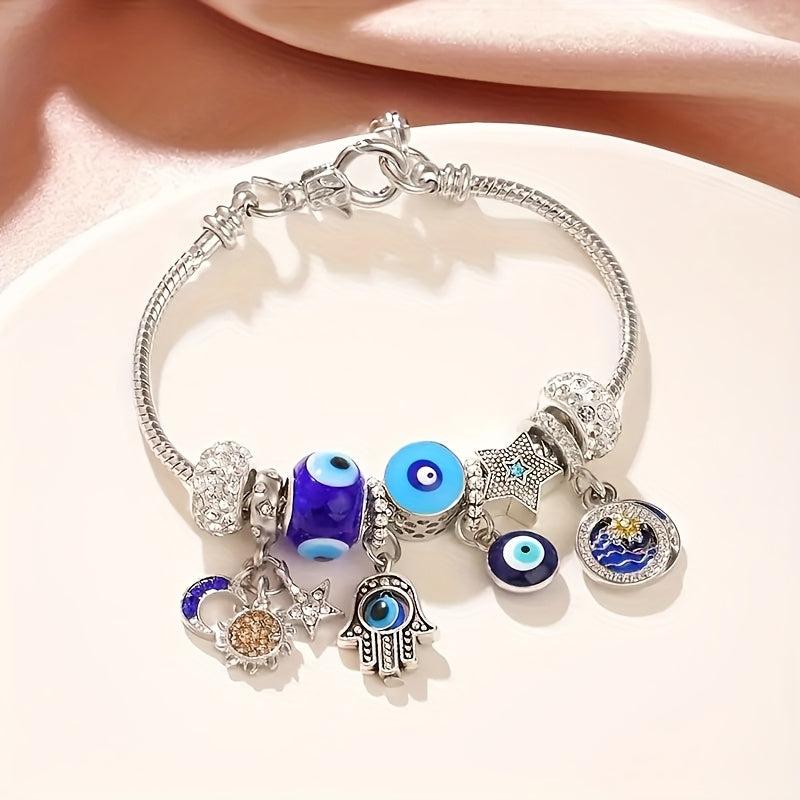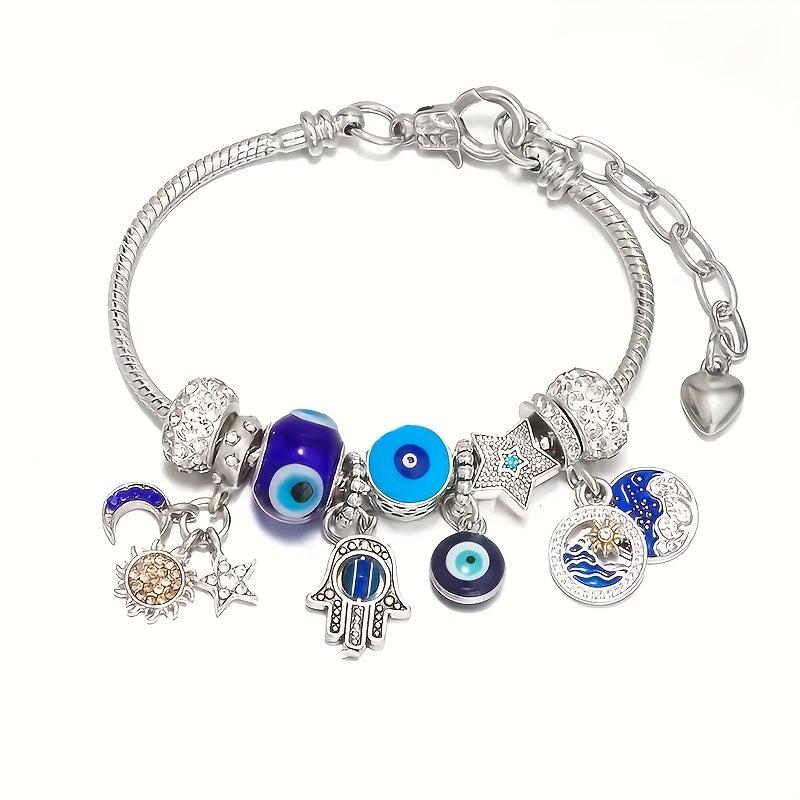 This bracelet features a Hamsa Hand charm and Boho Evil Eye design, making it a versatile accessory for daily and party wear. The plastic mosaic adds an elegant touch to the piece.